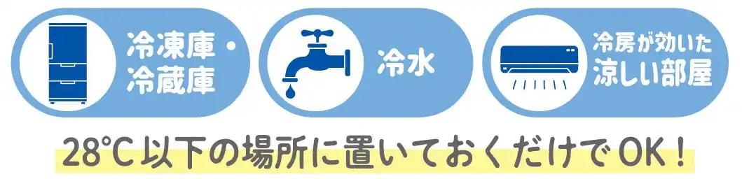 | 冷蔵庫・冷水・冷暗所など28℃以下で自然凍結。何度でも使えるエコ仕様。 | |||||||||