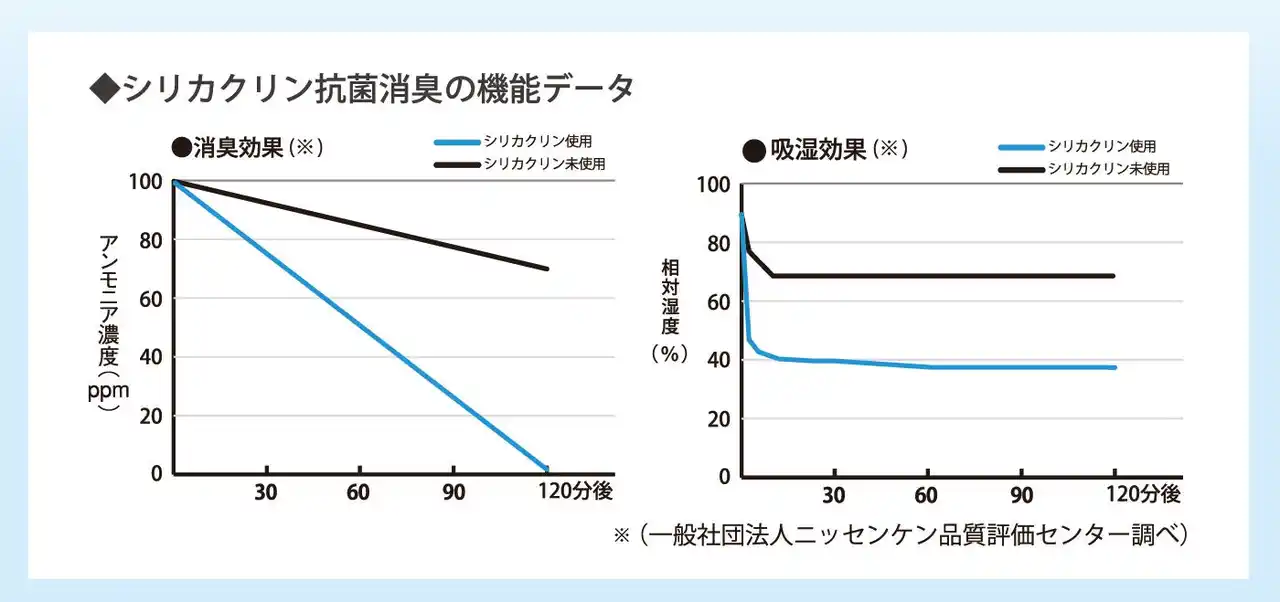 | 天然素材である「シリカゲル」を特殊製法で加工。ニオイと湿気を吸着して、強力な消臭効果と除湿効果を発揮する特殊素材です。 | |||||||||