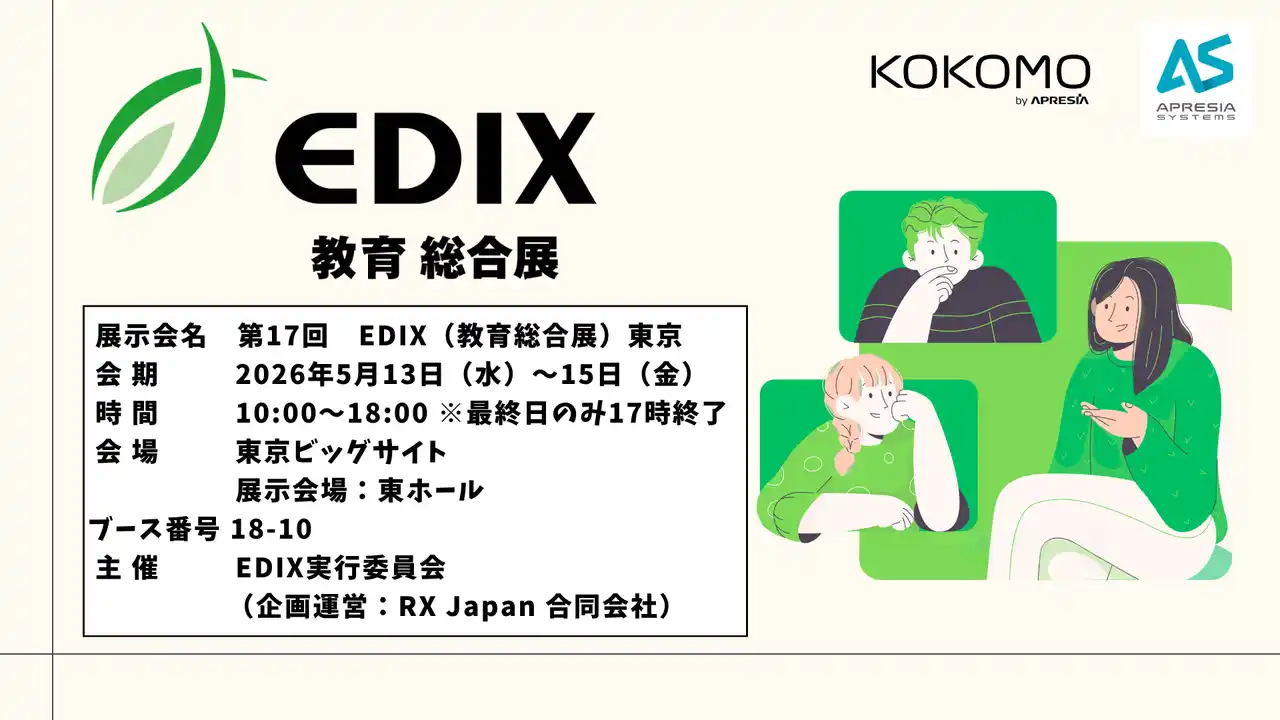 APRESIA Systems株式会社(本社 東京都中央区、代表取締役社長 末永 正彦)は、2026年5月13日(水)~15日(金)の3日間、東京ビッグサイトにて開催される第17回EDIX(教育総合展)東京に出展いたします。 |