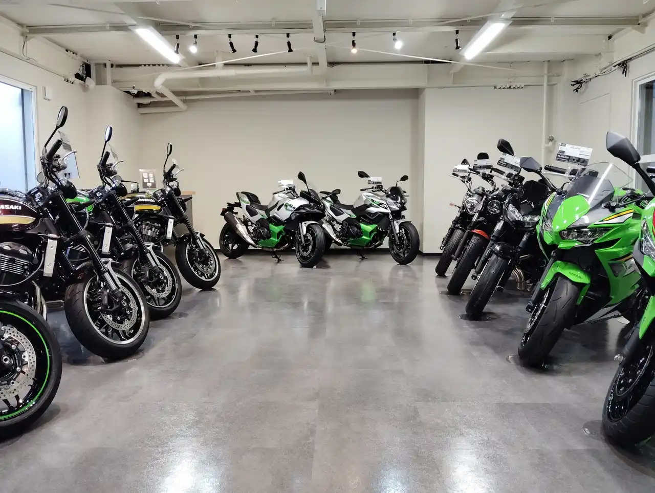 ・ショールームでは、良質な認定中古車を数多く展示。ゆったりとした展示により、カワサキモーターサイクルのプロフェッショナルが厳選した一品ものの車両をじっくりとご覧いただけます。 |