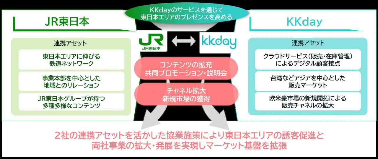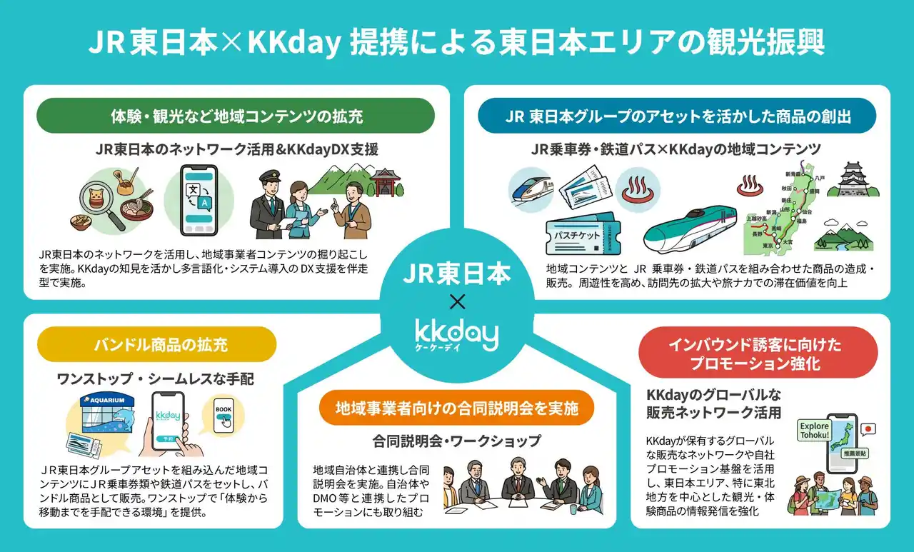 KKdayは、台湾を中心としたアジア市場をはじめ、欧米豪を含むグローバルな販売ネットワークを有し、体験型観光商品の造成・販売や、多言語・多通貨に対応した予約・販売基盤に強みを持っています。一方、JR東日本は、東日本一円に広がる鉄道ネットワークを基盤に、地域事業者や自治体と連携した観光コンテンツの創出に取り組んできました。 |