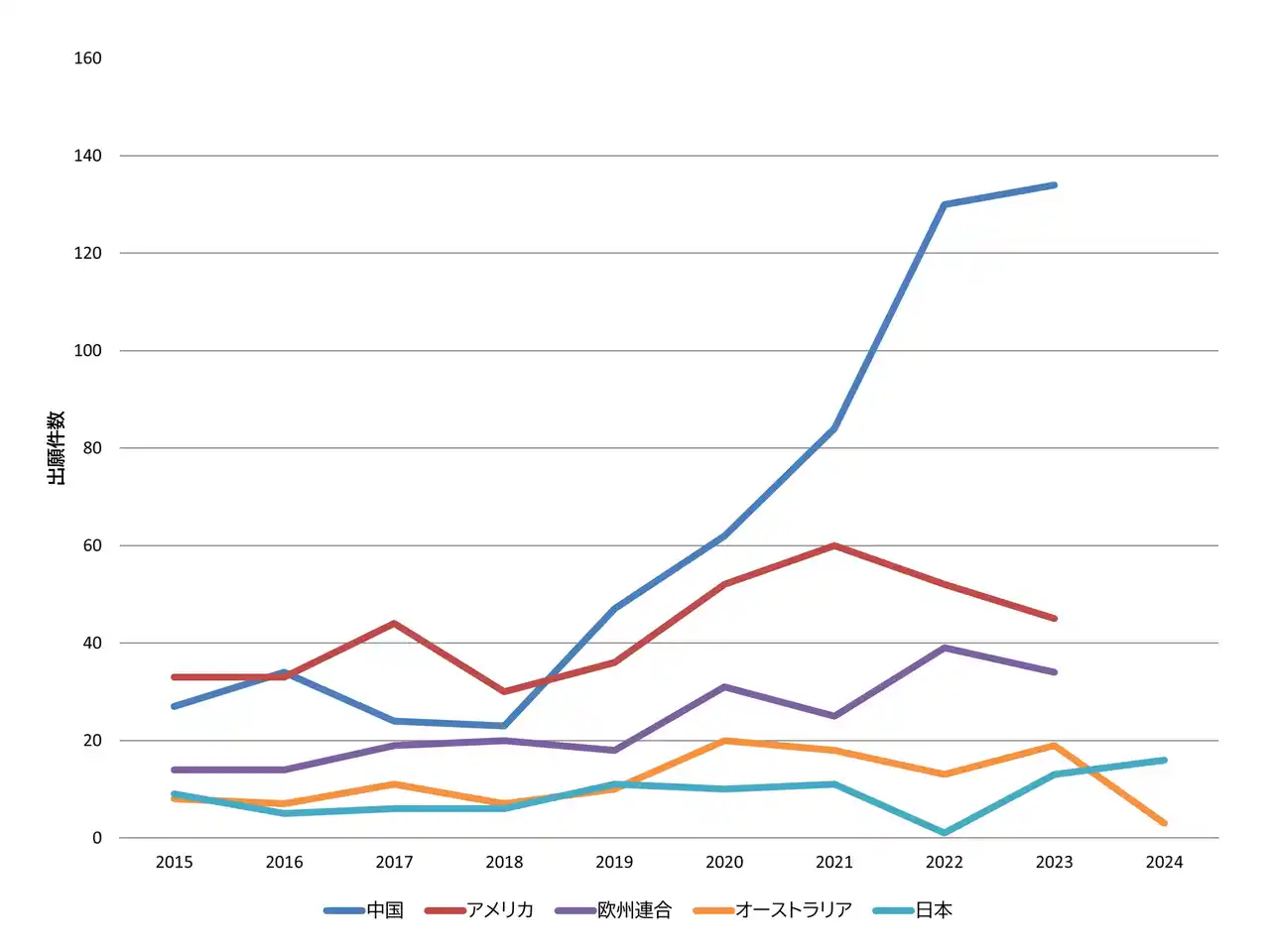特許出願数では、中国の特許出願の伸びが目立ちます。つづいて、アメリカや欧州も多くの出願をおこなっています。 |