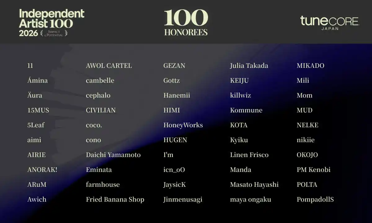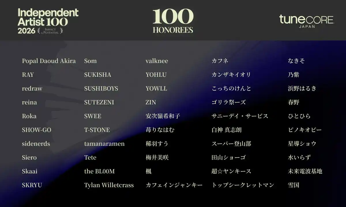 【TuneCore Japan INDEPENDENT ARTIST 100 - 2026 発表ページ】 https://www.tunecore.co.jp/events/independent-artist-100-2026 |