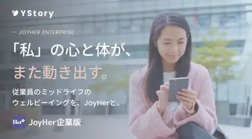 YStoryは、フェムテック領域で最先端の技術を提供するスタートアップ企業です。YStoryの代表的なサービスである「JoyHer(特許出願中)」は、更年期女性の健康をサポートするスマートフォンアプリです。データドリブン×エビデンスに基づき、一人ひとりに合わせたセルフケアのためのアドバイスを行います。また、コミュニティスペースも提供しており、JoyHerコミュニティでは、更年期の症状を経験した女性同士で繋がることができます。今後も、様々なサービスを展開し、ヘルシーリテラシーの向上および、ポジティブエイジングに貢献することを目指します。 |