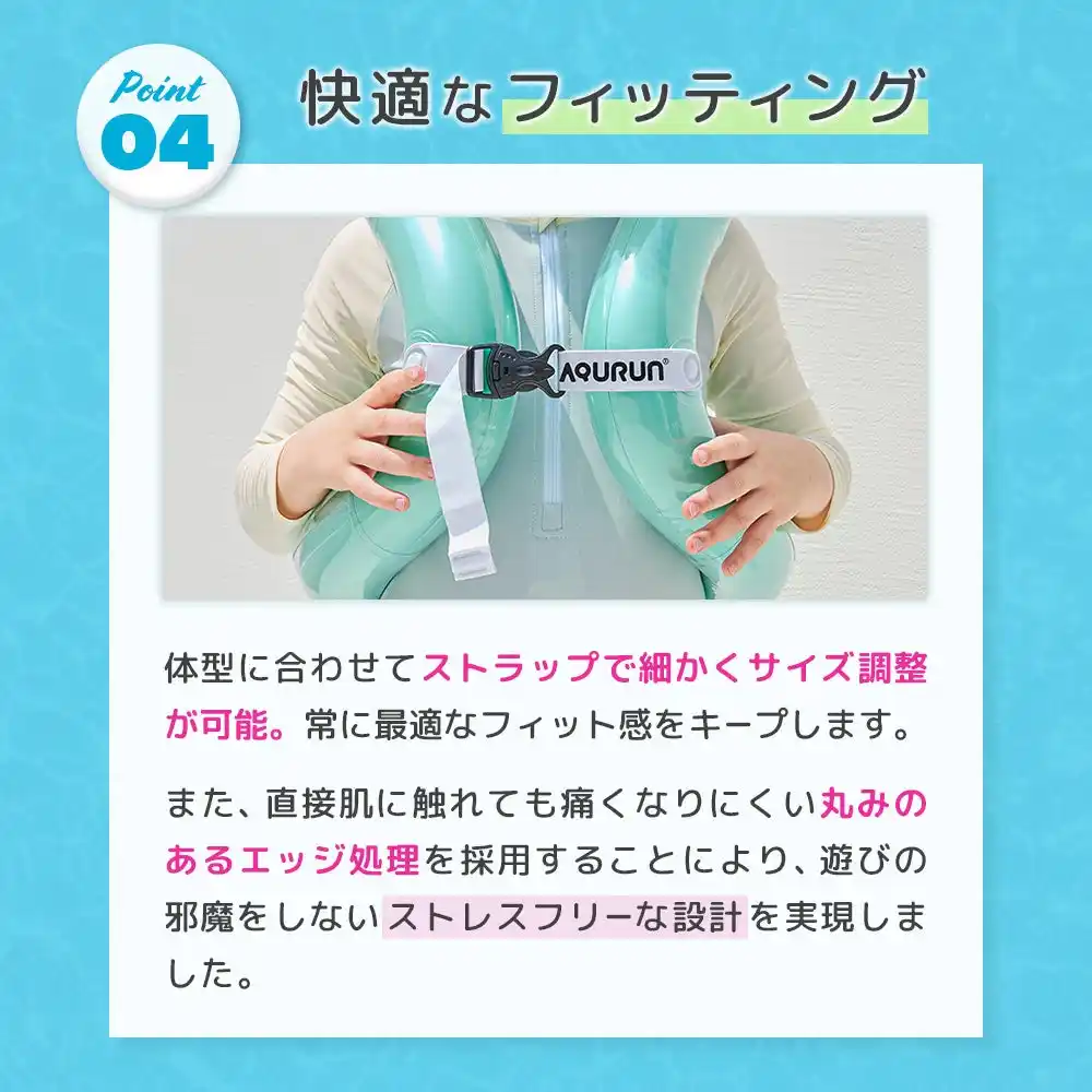 アームとボディが一体化した革新的なデザインで、自由な動きと安定した浮力を両立した水泳補助具です。 |
