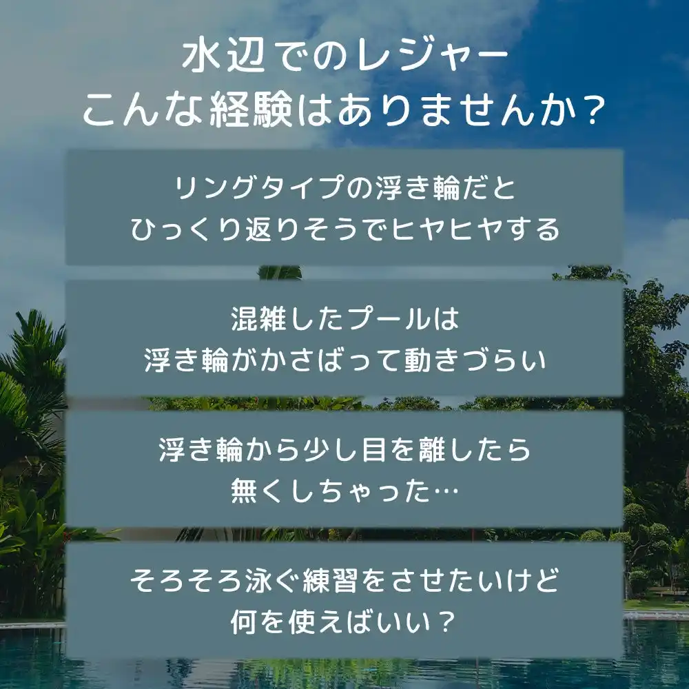 ※施設によって浮き輪や補助具の使用規定が異なります。リングベストをご使用の際は、事前に各施設のルールをご確認ください。 |