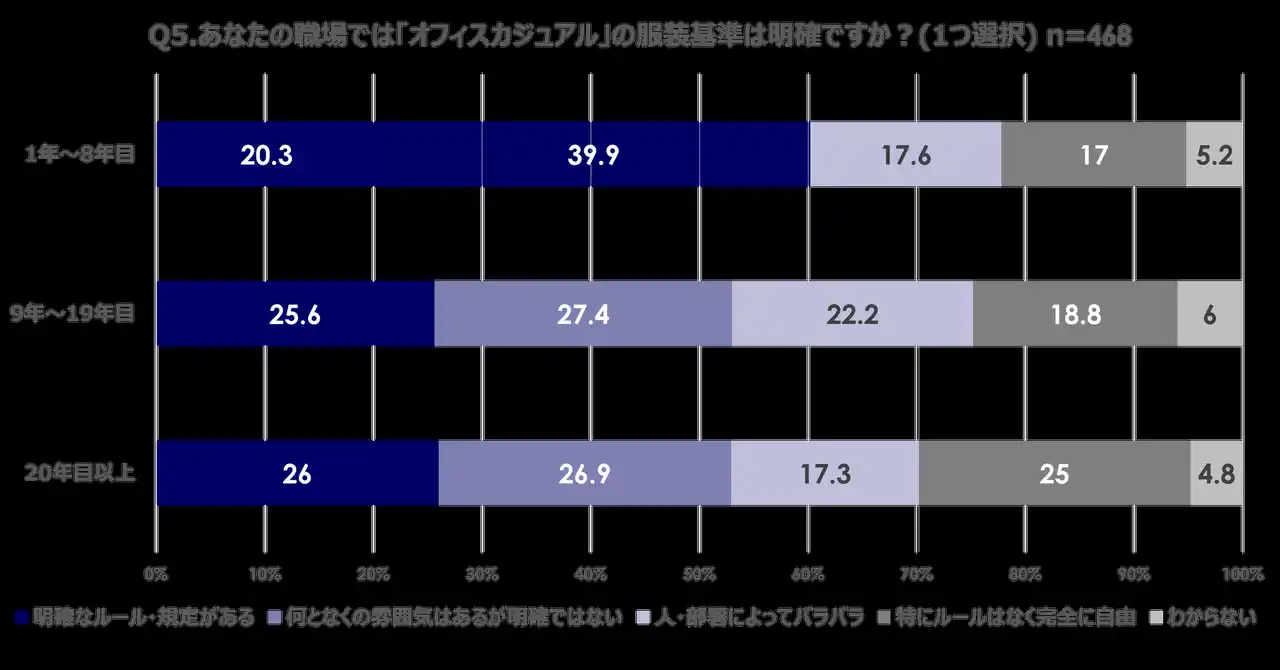 1年~8年目は”何となくの雰囲気はあるが明確ではない”が割合としては多く、一方で20年目以上は”明確なルール・規定がある”と”特にルールはなく完全に自由”が多く、世代によって回答に変化が出た結果となりました。 若手が職場の服装ルールを「曖昧」と感じるのは、実際に服装基準がないからではなく、職場の暗黙のルールをまだ習得できていない段階にあるためと考えられます。 |