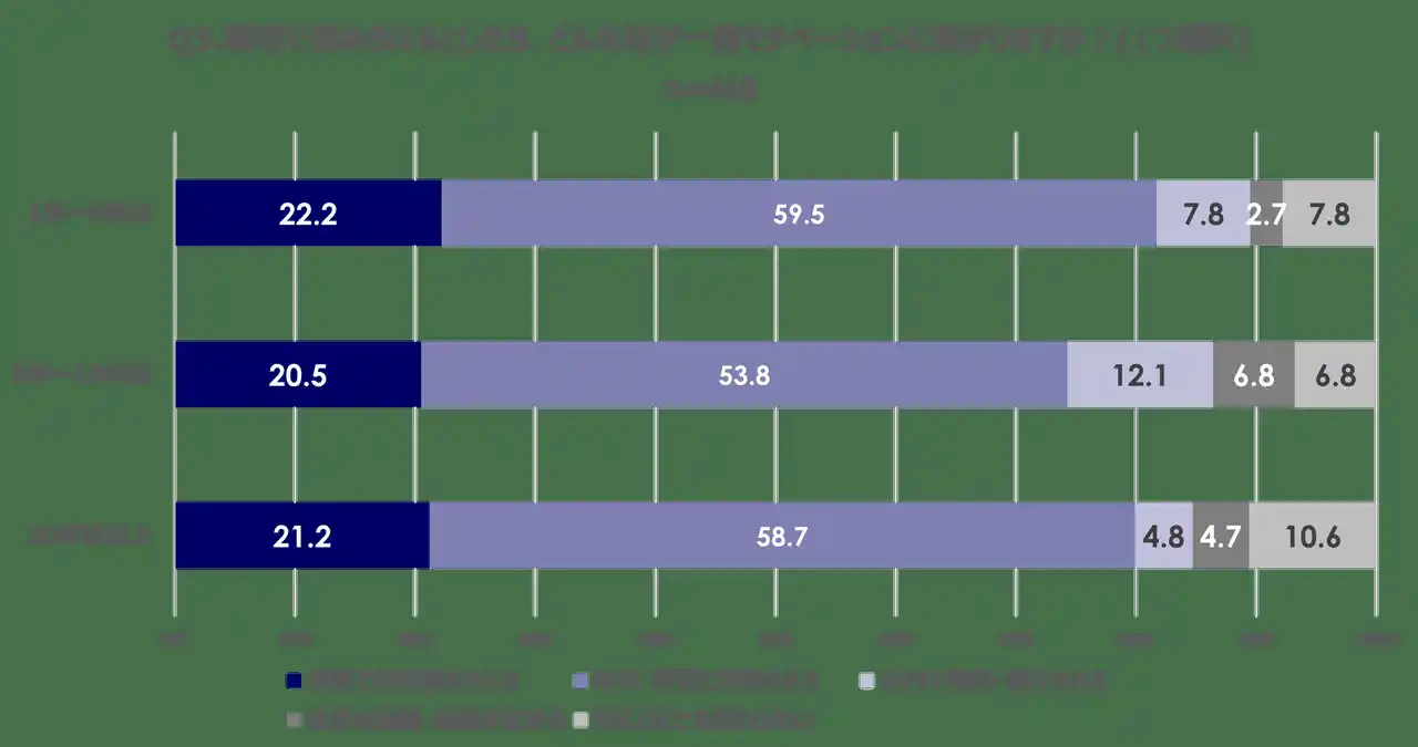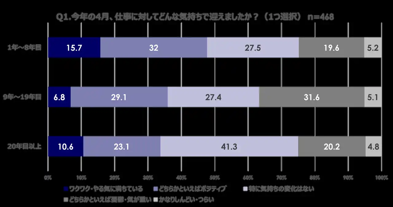 9年~19年目のモチベーション低下は、昇進・昇給の停滞感や、仕事への慣れによる刺激の減少と重なりやすい時期と伺えます。一方で、20年目以上のベテランは、ポジティブ回答が若手に次いで高い結果となりました。 モチベーションについては、「若手↑中堅↓ベテラン↑」という三段階の変化が、この調査の最大のポイントといえます。 |