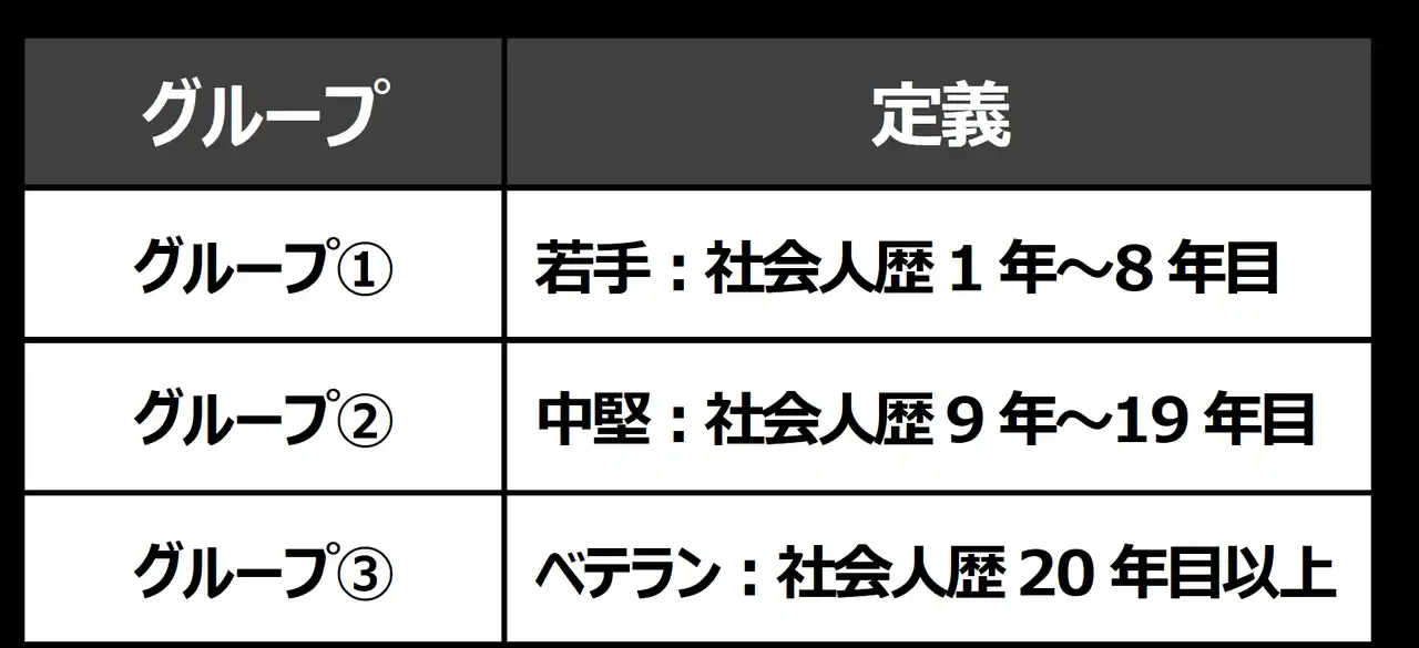 | 本調査では、現在就業中の正社員・契約社員468名に、社会人経験年数によって「仕事への意識・服装への意識」がどのように変化するかを調査し、回答者を社会人歴に応じて3グループに分類し、比較分析を行いました。 | |||