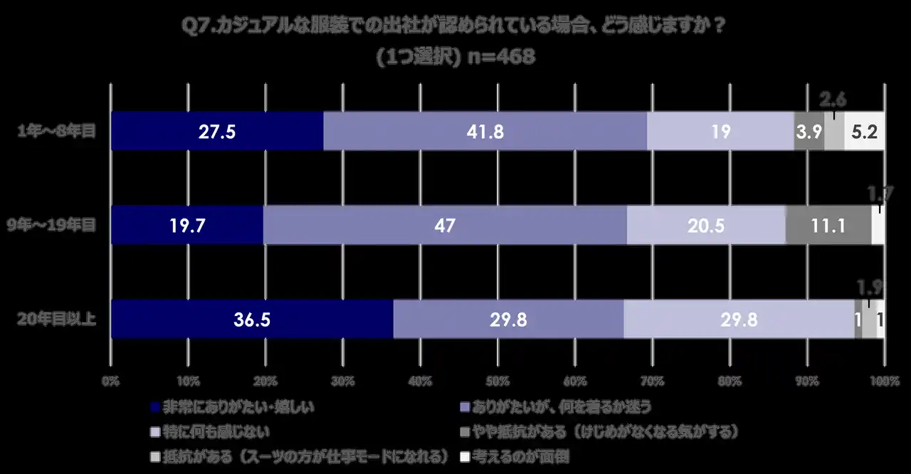 | 20年目以上は”非常ありがたい”・”嬉しい”の割合が高い=自分が着たいものを着たい、もしくは固い格好をしたくない。一方で、9年~19年目、1年~8年目は”迷う”や”抵抗がある”等のマイナスのイメージが強い結果になりました。 | |||