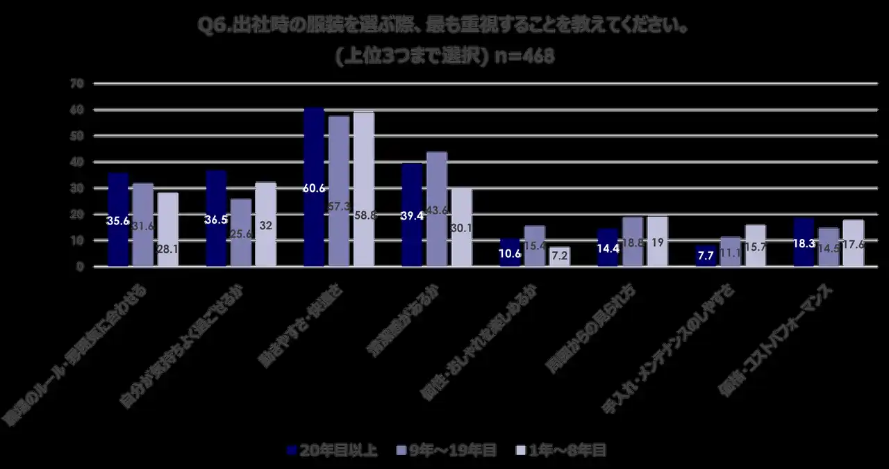 | 服装選びの軸の変化は、仕事に対する自信の成長を映す鏡ともいえます。若手は「周囲やルール」といった他者基準を重視する一方、ベテランは「快適さや自分らしさ」といった自己基準へとシフトしており、年齢とともにその変化が表れていることがわかりました。 | |||