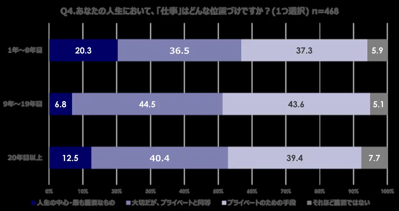 | 9年目以降はプライベートの為に仕事を行う割合が一定数存在。また、TOPIC2.も踏まえてこの転換点は、結婚・育児・介護など、ライフステージの変化と重なる時期とも受け取れます。仕事への熱量が下がったわけではなく、"仕事と生活のバランスを意識的に設計し始める"成熟の表れとも読み取れます。TOPIC1.と同様の「若手↑中堅↓ベテラン↑」の結果となりました。 | |||