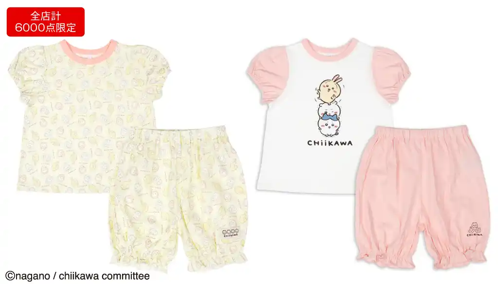 パジャマパーティーズの衣装を着た、ちいかわたちがたくさん散りばめられた総柄デザインと、やさしいピンクとプリントが映えるデザインをご用意しました。袖口とパンツの裾にはフリルをあしらっています。 |