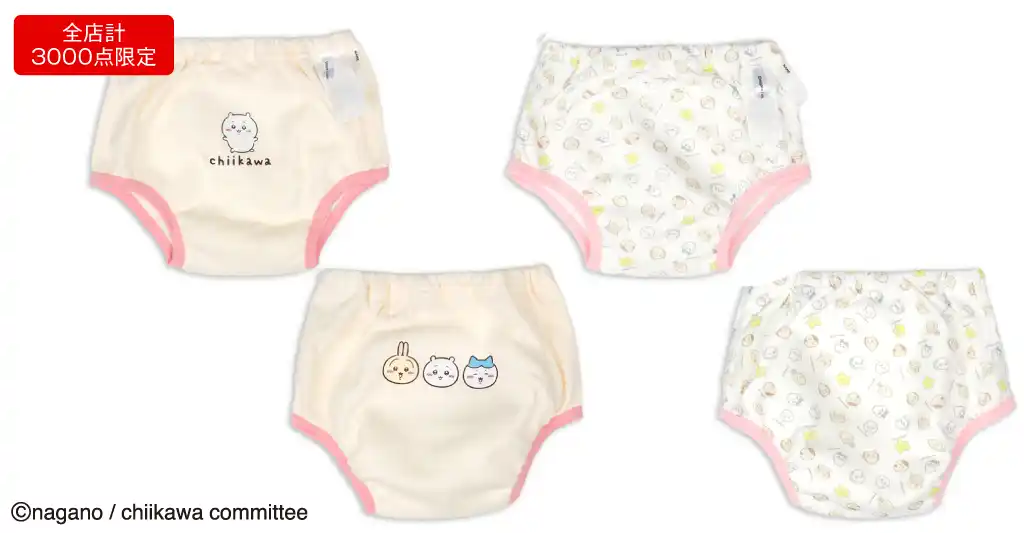 ちいかわ・ハチワレ・うさぎの3デザイン展開。おしりのお顔モチーフがポイント。 |
