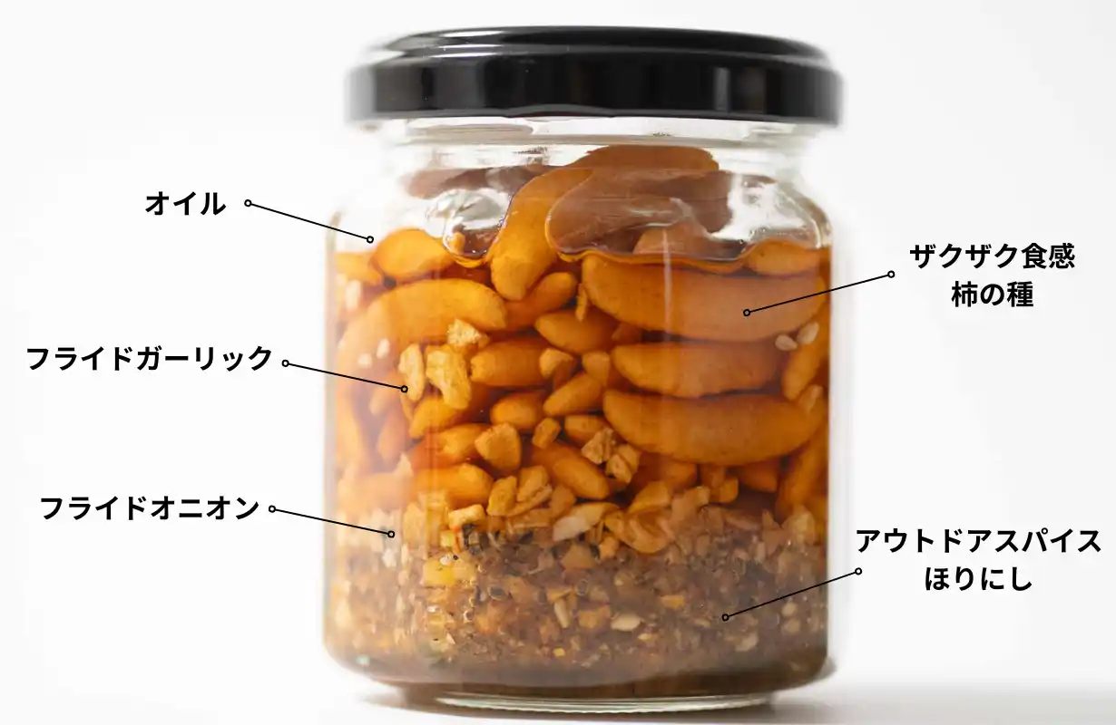 オイルをまとった柿の種に、ガーリックの香りとスパイスの旨みが特徴の「ほりにし」の味わいを絡めた、新しい"ご飯のおとも"です。コンパクトな瓶タイプだから持ち運びも手軽で、「なるべく身軽に、でも食事は妥協したくない」というアウトドア派の要望にしっかり応えます。ご飯はもちろん、枝豆や豆腐などのおつまみアレンジから、焼きそばやお肉などのメイン料理まで、ワンスプーンでぐっとおいしさが引き立ちます。 |