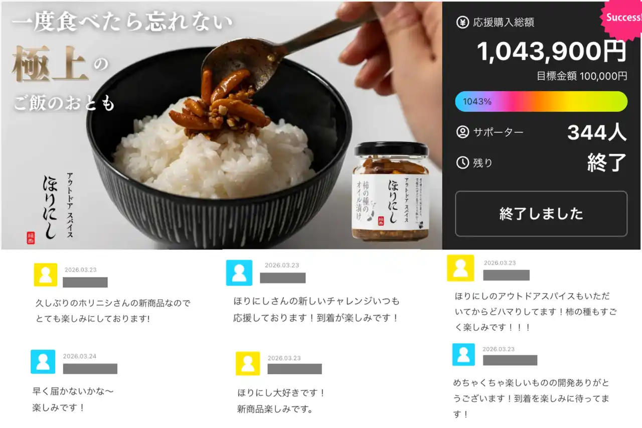 2026年3月23日(月)~4月12日(日)の21日間、クラウドファンディングサイト「Makuake」にて先行販売を実施。結果1,043,900円を販売し、「今回も期待して待っています」「久しぶりのホリニシさんの新商品なのでとても楽しみにしております!」「めちゃくちゃ楽しいものの開発ありがとうございます!到着を楽しみに待ってます!」など、多くのお客様から期待の声をいただきました。 |
