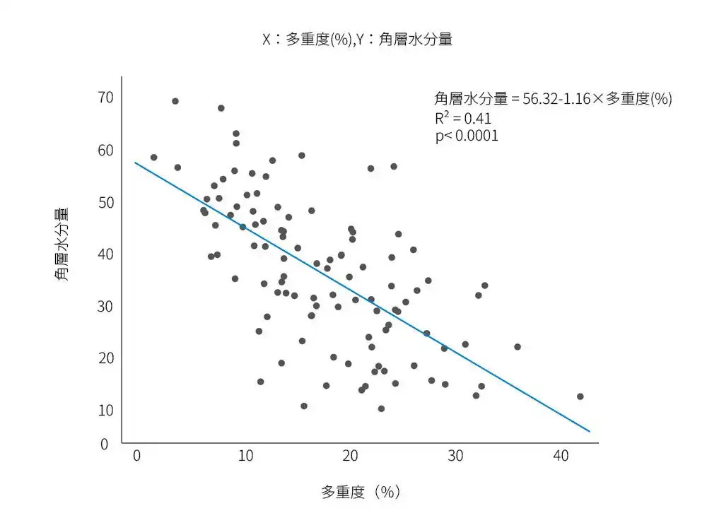 その結果、肌の明るさは年代が上がるとともに低下しており、加齢で肌が暗くなることが示唆されました。一方、角層水分量には年代差がなく、どの年代にも水分量の多い人と少ない人が存在することが明らかになりました。また、ターンオーバーが乱れ角層が剥がれ落ちずに溜まる「角層の重層化」を示す角層の多重度についても年代差は見られず、角層水分量と角層の多重度には負の相関がみられました。これらのことから、角層水分量と角層表面の状態には関連があり、肌の明るさのみでは評価しきれない、見た目の肌の透明感や光の散乱に角層水分量が影響している可能性が示唆されました。 |
