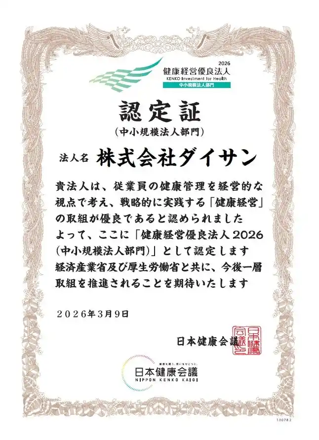 株式会社ダイサン(代表取締役社長:藤田武敏)は、2026年3月9日(月)、経済産業省と日本健康会議が共同で選出する「健康経営優良法人2026 (中小規模法人部門)」に認定されました。2025年、2024年に続き、3年連続の認定取得となります。 |