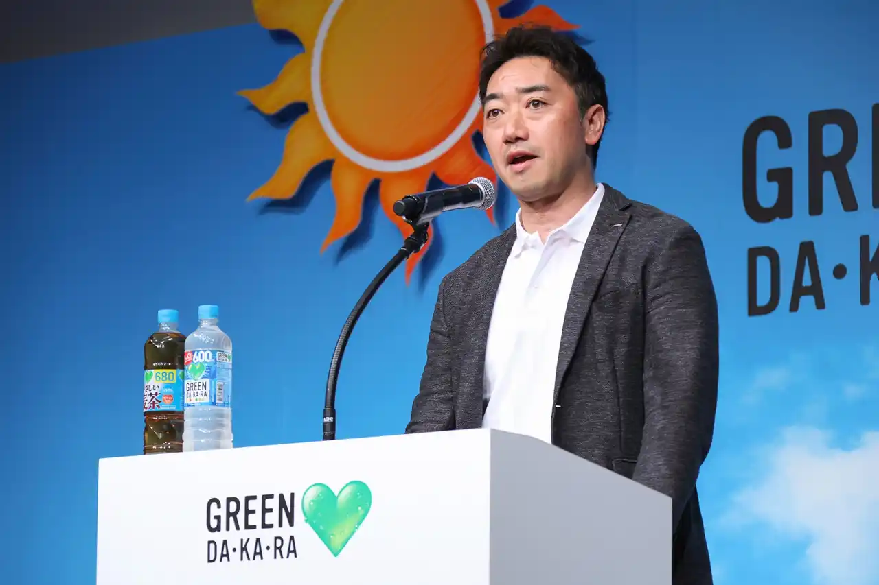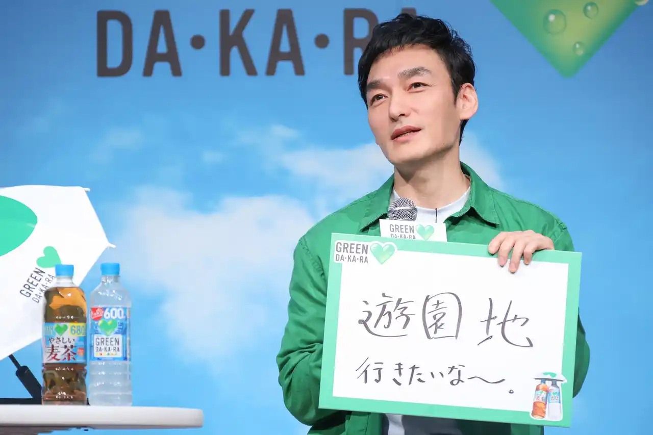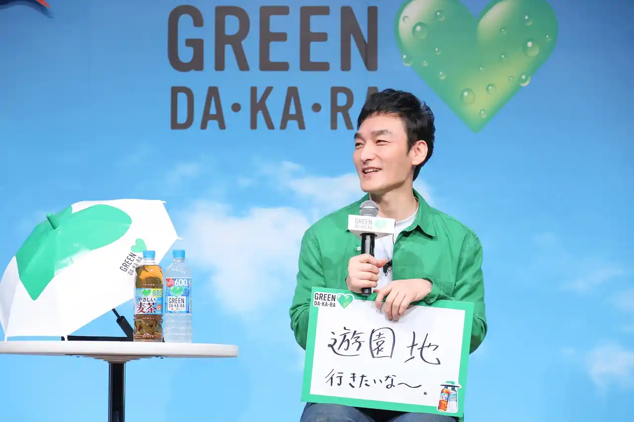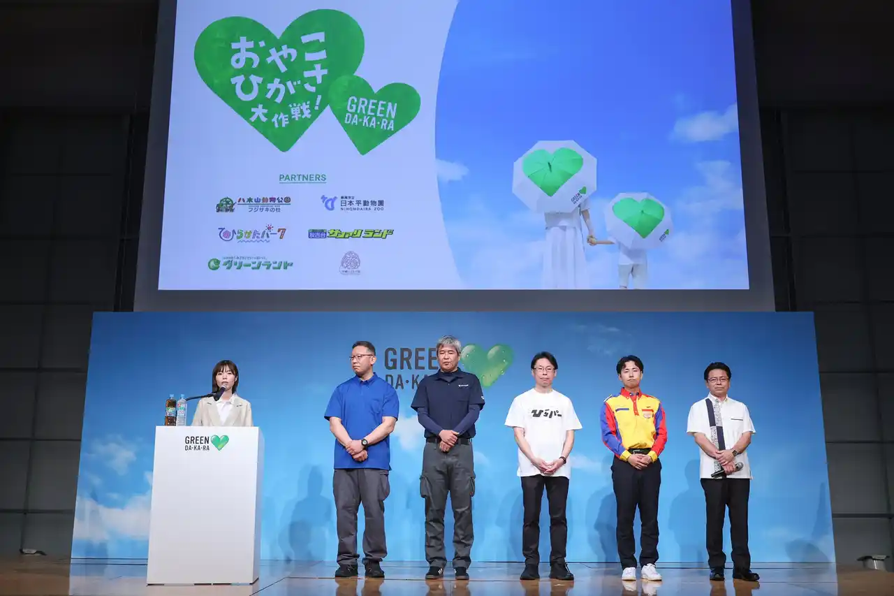 発表会では、「GREEN DA・KA・RA」の2026年の活動方針を説明するとともに、新CMを披露しました。さらに、CMで『やさしいマン』を演じる草彅剛さんをゲストにお迎えし、CMの見どころや撮影の舞台裏、この夏おでかけしたい場所などについて語っていただきました。また、近年の猛暑の影響により、親子の外出の機会が制限されつつある社会背景を踏まえて、全国6カ所のレジャー施設で展開する新たな取り組み「おやこひがさ大作戦!」を発表しました。発表会では、「GREEN