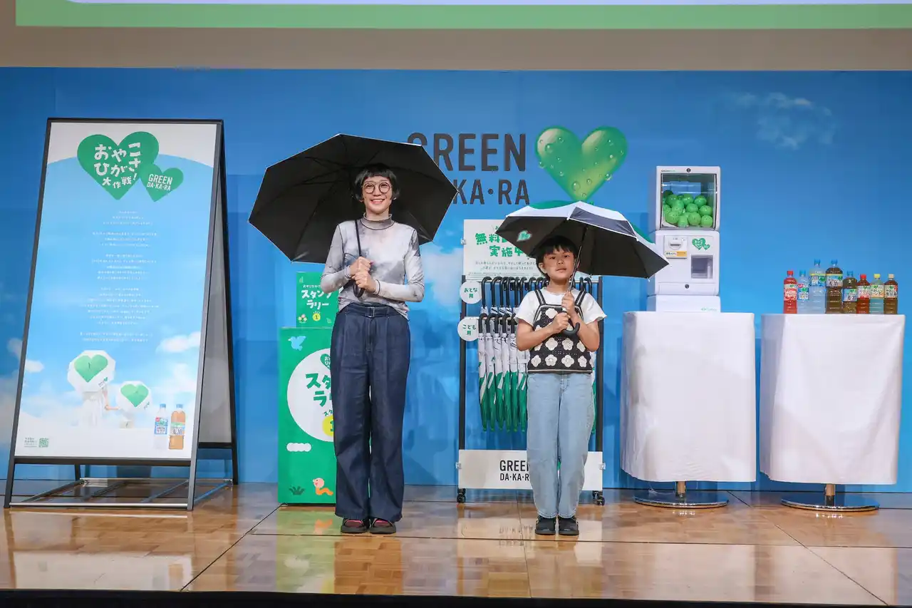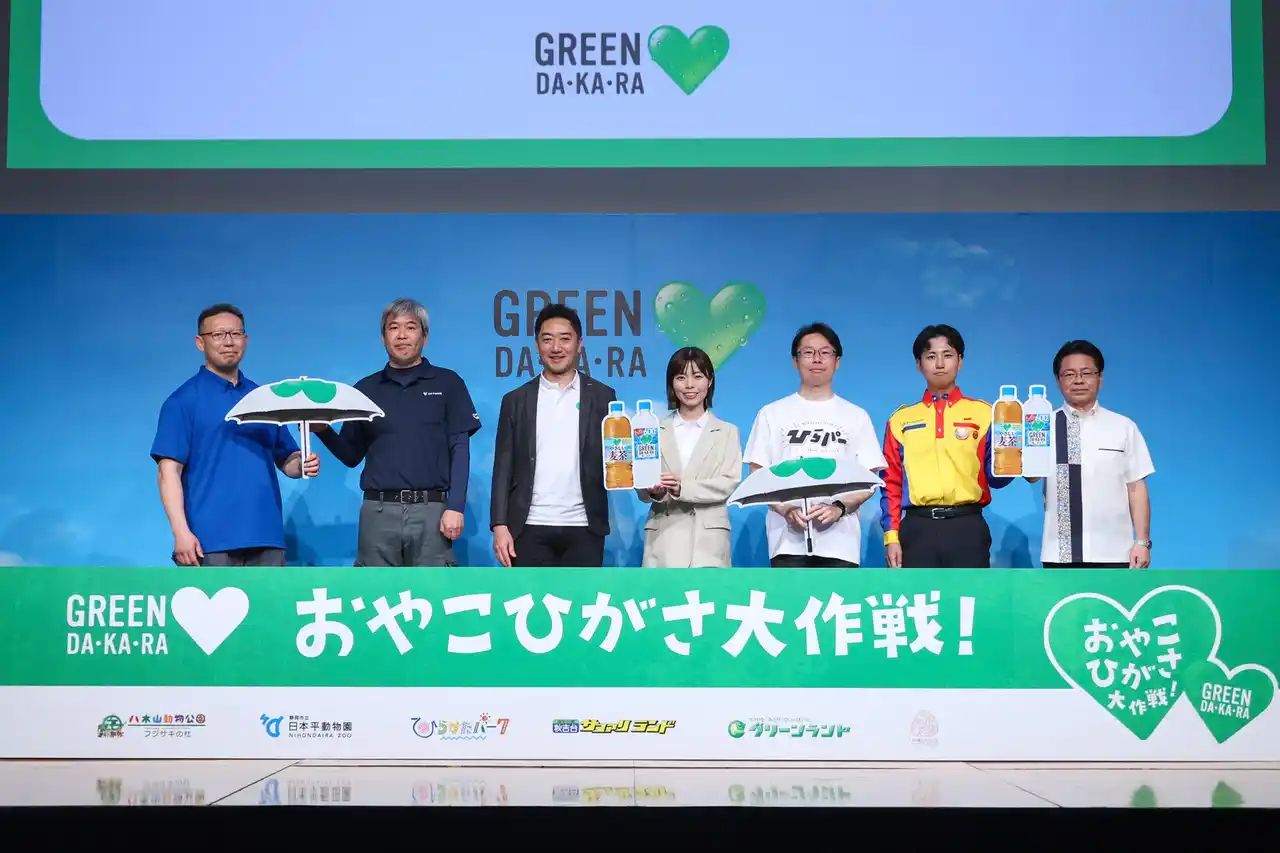 サントリービバレッジ&フード株式会社は、4月27日(月)に「サントリー『GREEN DA・KA・RA』 新CM&『おやこひがさ大作戦!』発表会」を開催し、5月1日(金)より全国で放映を開始する「GREEN DA・KA・RA」の新CMの公開と、親子に日傘の活用を提案する新たな取り組み「おやこひがさ大作戦!」の始動を発表しました。 |