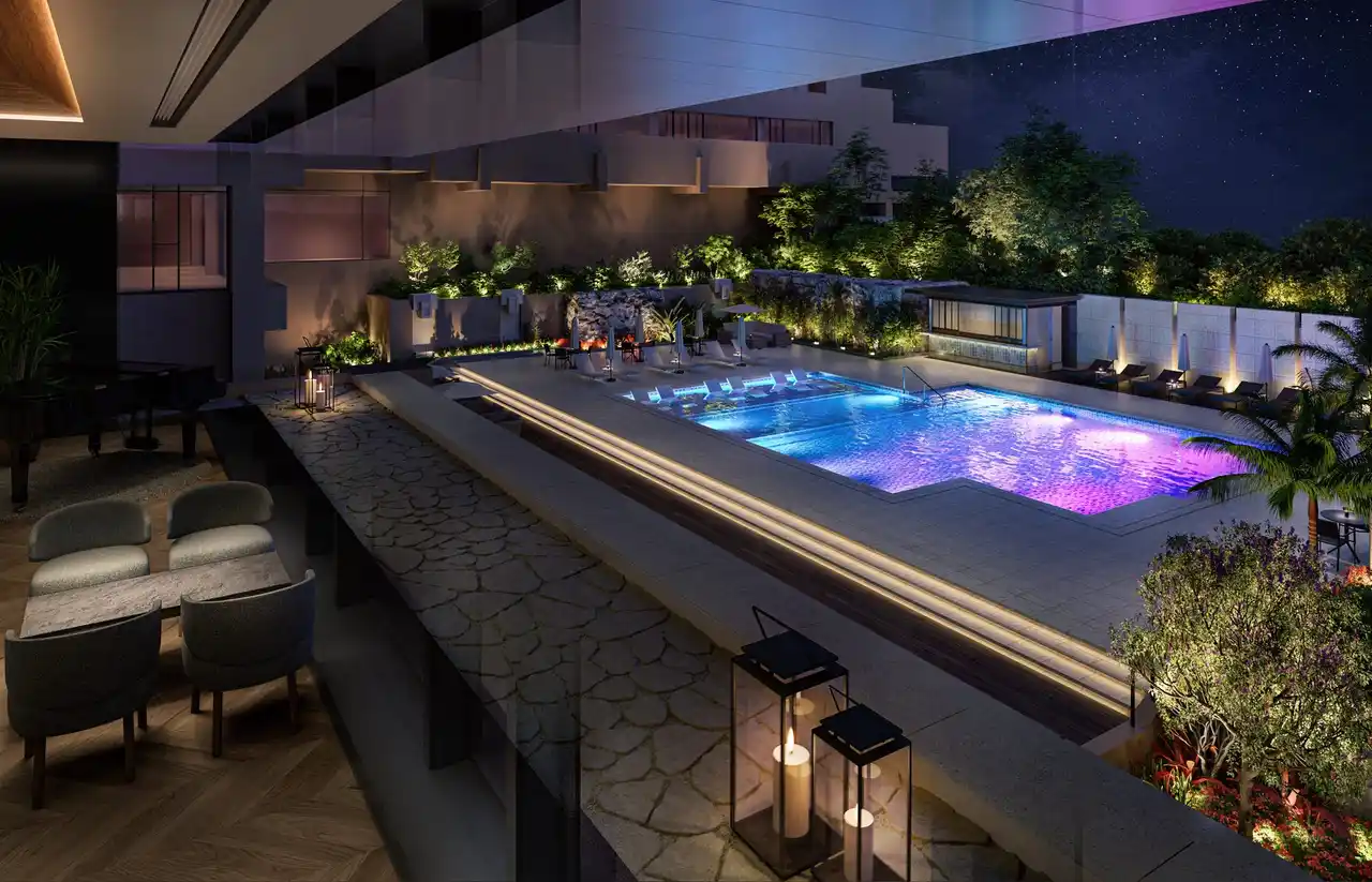 ガーデンプールは、昼夜・季節を問わずお楽しみいただける温水仕様へとグレードアップ。特にナイトプールが醸し出す夜のひとときは、当ホテルの新たな象徴となります。幻想的なライトアップが水面を彩り、那覇の夜をきらびやかに演出。都心の喧騒を忘れる艶やかな雰囲気を体験いただけます。 |