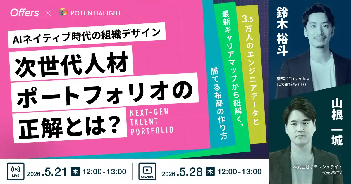 AI時代のエンジニア転職プラットフォーム「Offers(オファーズ)」を運営する株式会社overflow(本社:東京都港区、代表取締役:鈴木裕斗、以下 overflow)は、「AIネイティブ時代の組織デザイン。次世代人材ポートフォリオの正解とは?」を2026年5月21日(木)にライブ配信、2026年5月28日(木)にアーカイブ配信いたします。 |