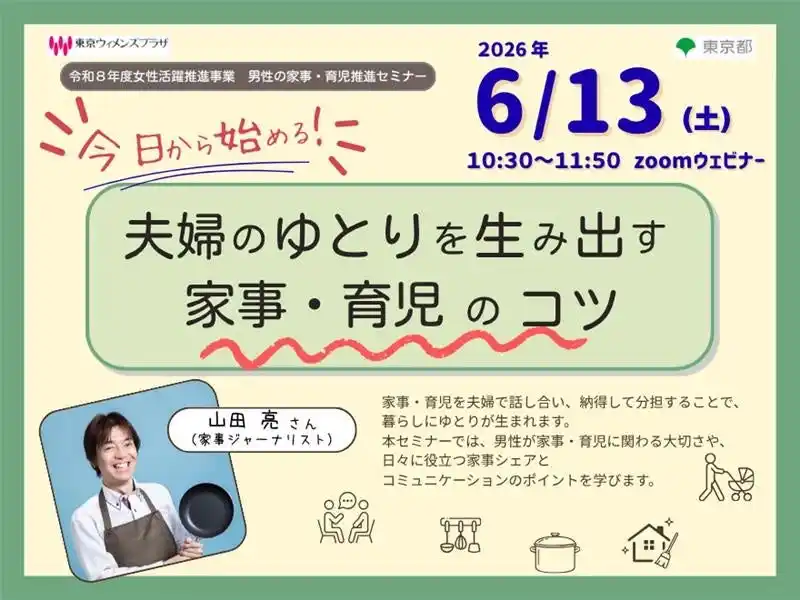 【東京都】 【6月13日オンライン開催】今日から始める!夫婦のゆとりを生み出す家事・育児のコツ(男性の家事・育児推進セミナー)申込受付中