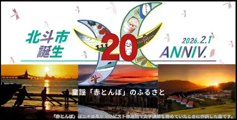 北斗市誕生20周年を祝うロゴマークと、今年度の新幹線発車メロディに採用予定の童謡「赤とんぼ」を題材としています。このデザインには、北斗市観光協会が実施したフォトコンテストの入選作品が用いられています。 |