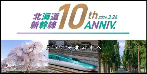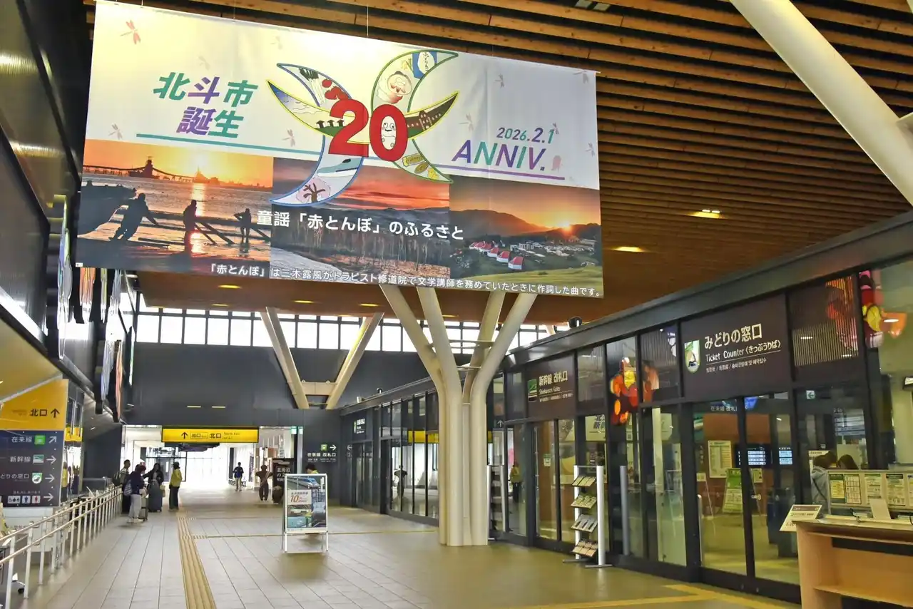 令和8年2月1日、北斗市は誕生20周年を迎え、さらに令和8年3月26日には北海道新幹線の開業10周年を迎えます。これを記念して、懸垂幕を新函館北斗駅構内に設置しました。 |