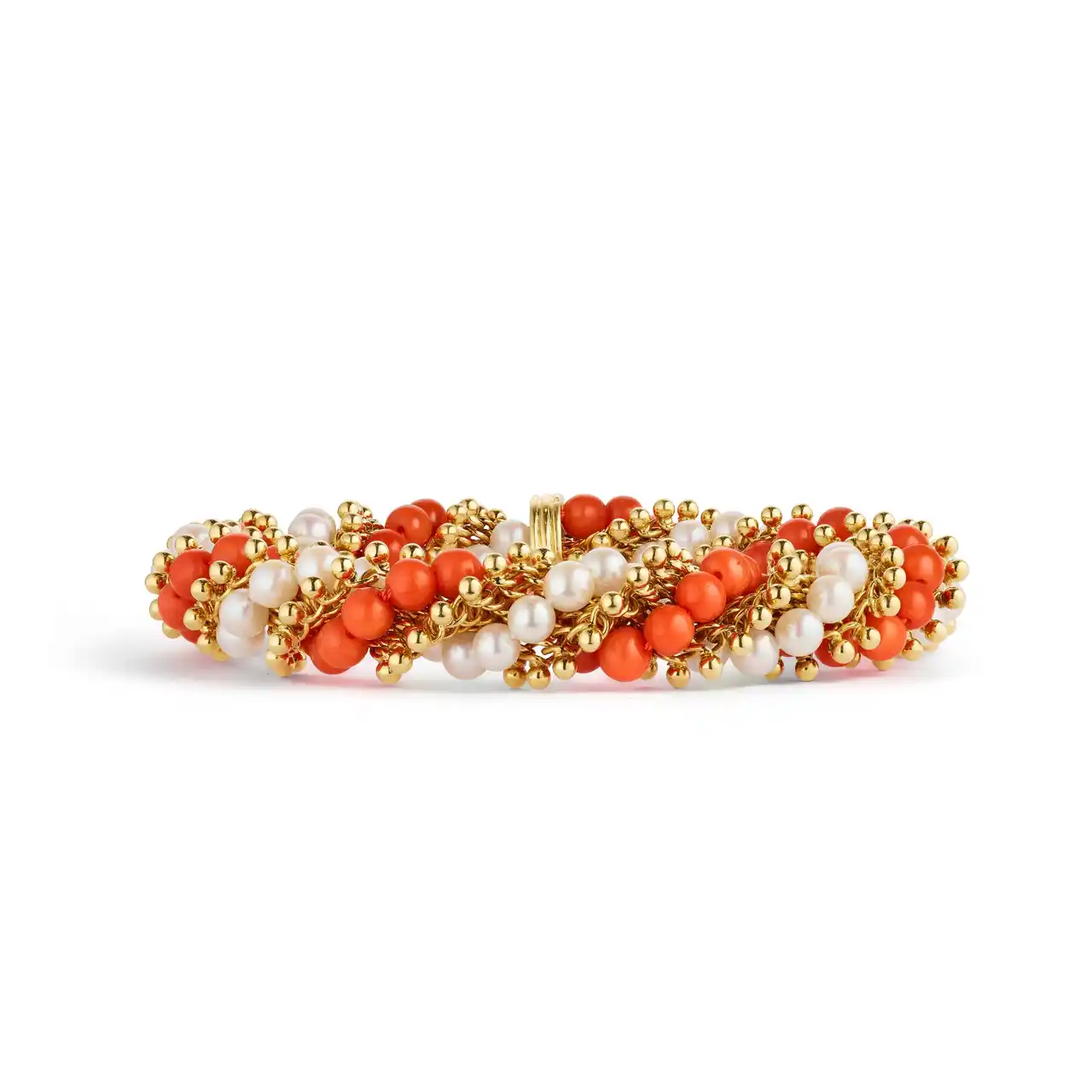 1963年には、ゴールドビーズにカラーストーンを組み合わせたツイスト コレクションが登場しました。赤みを帯びたオレンジのコーラル、深いブルーを湛えたラピスラズリ、アジュールブルーのターコイズが、養殖パールやゴールドビーズとともに繊細なツイストを織りなしています。これらの作品には、丸みを帯びたボリュームと対照的な組み合わせという、当時の美意識が反映されています。 |