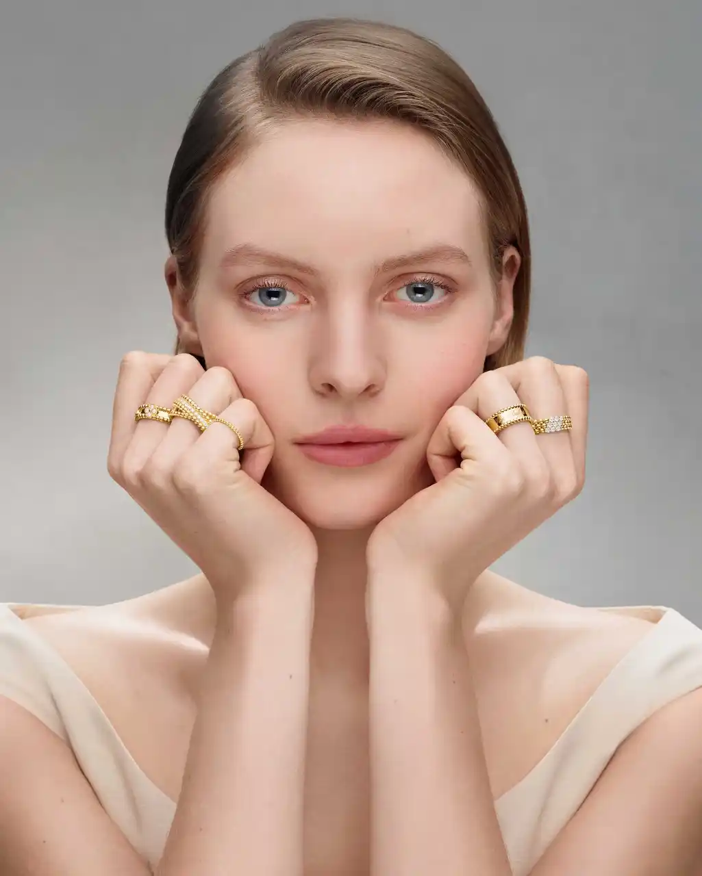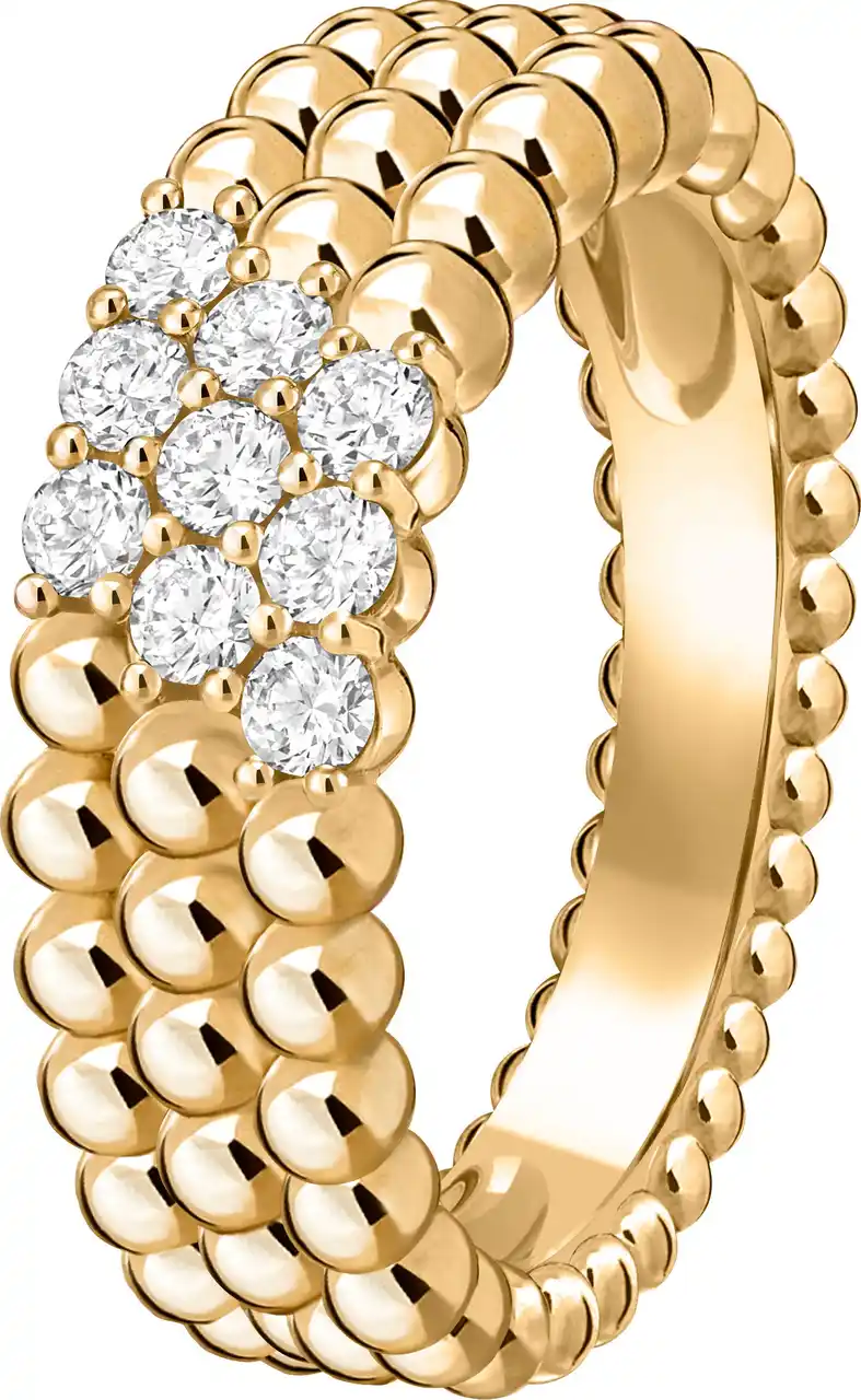 今回の新作では、2022年に発表された5連モデルのペルレ リングで取り入れられたデザインを受け継ぎ、発展させました。新たなデザインでは、さまざまなサイズのゴールドビーズが3連のラインを構成しながら指元を包み込みます。最も大きなビーズがリングのトップを飾る一方、最も細かいビーズが反対側に配置され、調和の取れたグラデーションを織りなしています。 |