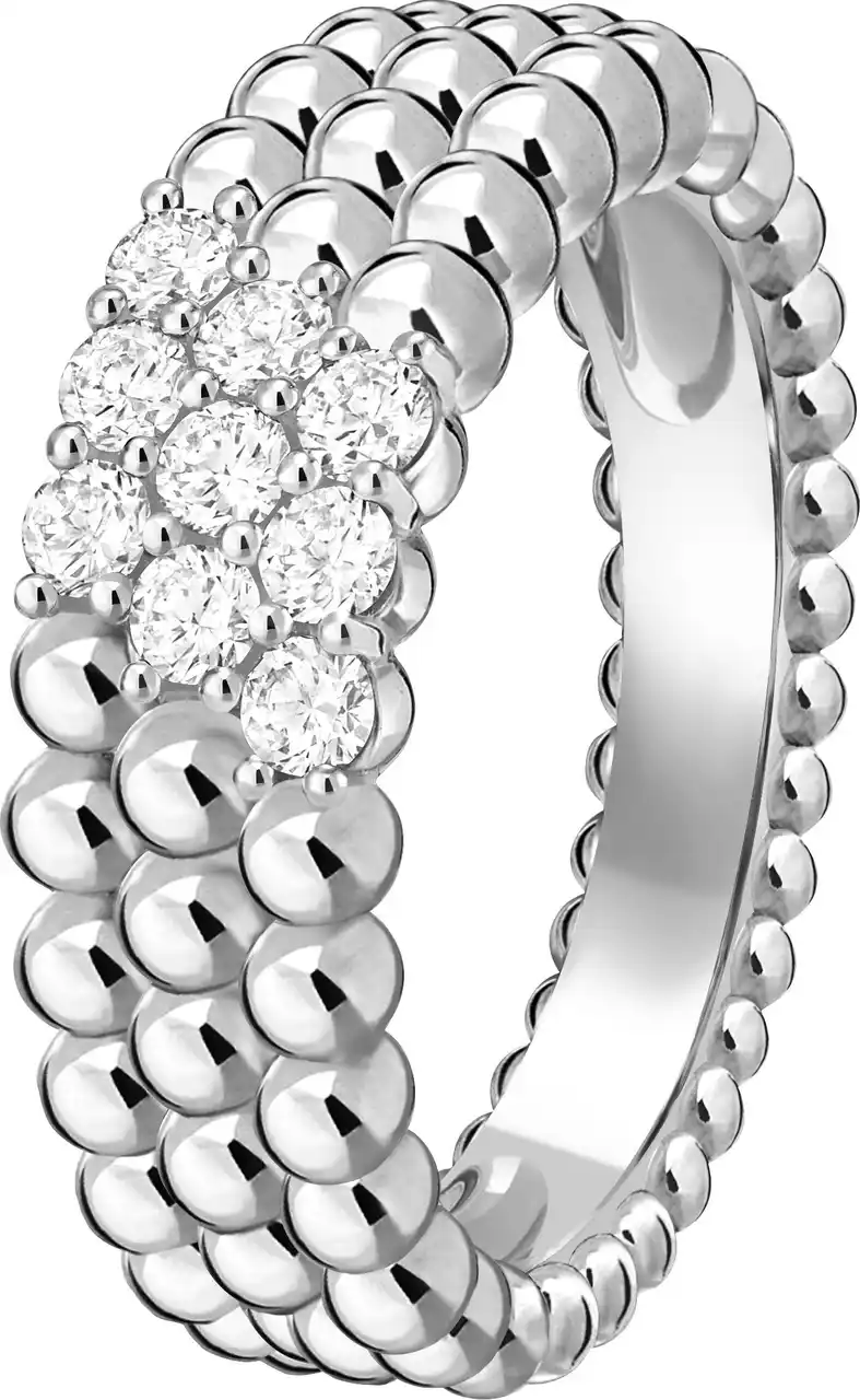 ダイヤモンドは、複雑なネイルセッティングを施すことでゴールドビーズとなめらかに融合し、流れるようなラインを形成します。このダイナミックな構成により、手の動きに合わせて鮮烈な光を放ちます。このリングは、気分や好みに応じてペルレ コレクションのほかのジュエリーと自由に組み合わせ、エレガントなアンサンブルを創り出すことができます。 |