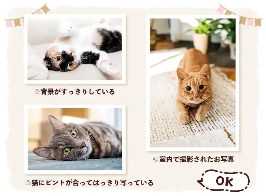 今回募集するのは1月~6月のページに掲載するお写真ですが、その月らしさや季節感は必要ありません。ポイントは、いつもお家で気ままに過ごしている猫の「とびきり、かわいい!」姿です! |