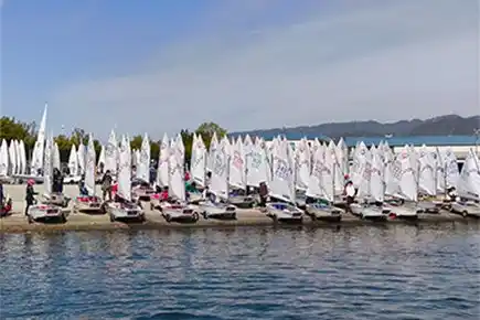 | 本大会は、日本各地から海とヨットを愛する小中学生の選手が集い、オプティミスト級ディンギーによるヨットレースを2日間にわたって実施する大会です。今年は計7レースが行われ、選手一人ひとりが日ごろの練習成果を発揮する非常に意義深い大会となりました。今回は、小学3年生から中学3年生まで総勢57名の選手が出場し、終始白熱したレースが繰り広げられました。上位入賞者には、全日本選手権への出場権が与えられます。当社は懸命にレースに挑む選手の皆さまの努力と健闘を称え、「フルノ賞」と「フルノラッキー賞」の2賞を授与しました。 | ||||||||||||||