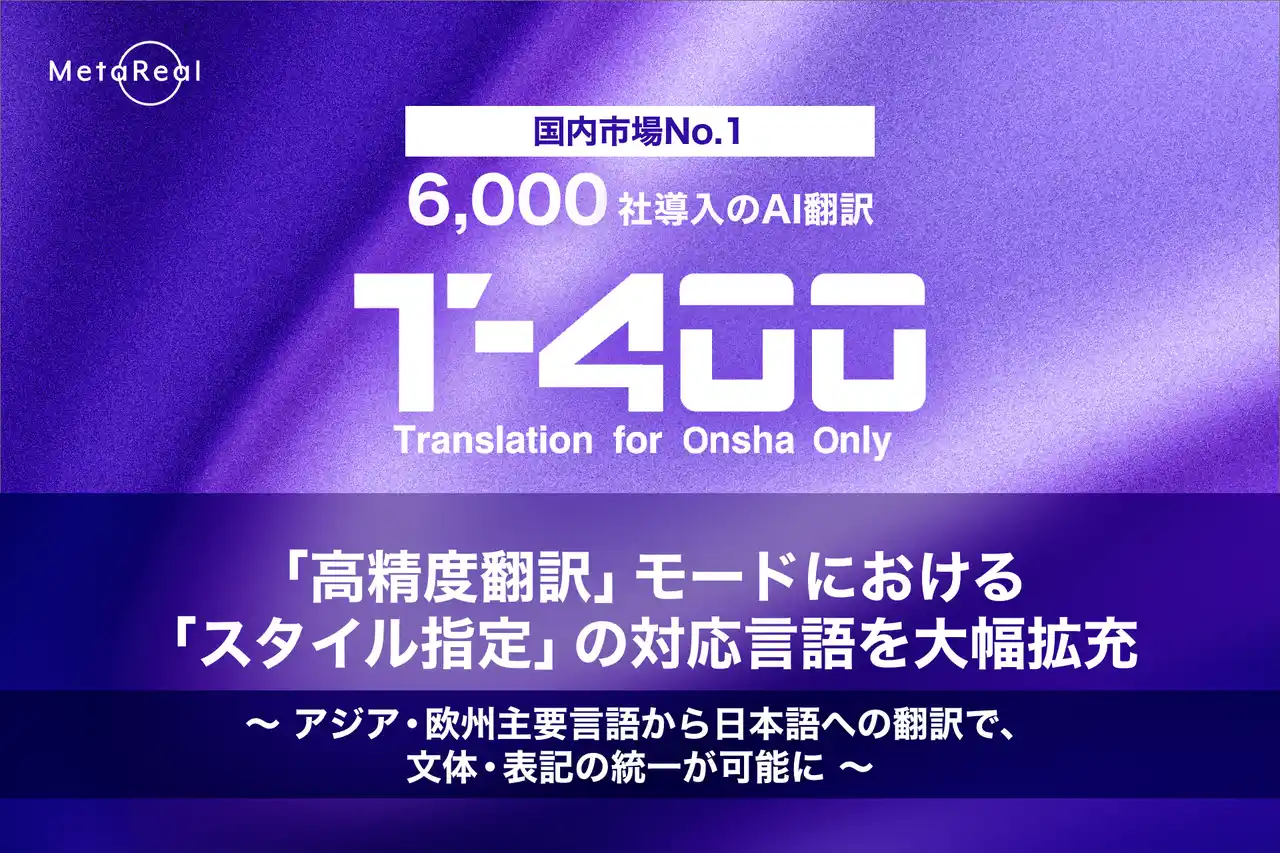 株式会社メタリアルグループで、国内市場No.1※1のAI翻訳サービスを開発・提供する株式会社ロゼッタ(代表取締役:五石 順一)は、2026年4月28日、高精度産業翻訳AI「T-4OO(ティーフォーオーオー)」において、「高精度翻訳」モードで利用可能な「スタイル指定」機能の対応言語を拡充したことをお知らせします。 |