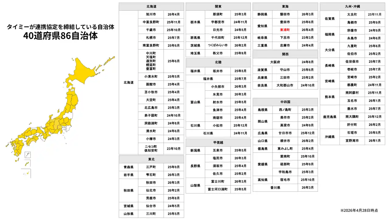 当社はこれまで40道府県・85自治体と連携協定を締結しており、今回の東浦町との連携は40道府県・86自治体目となります(※)。 |