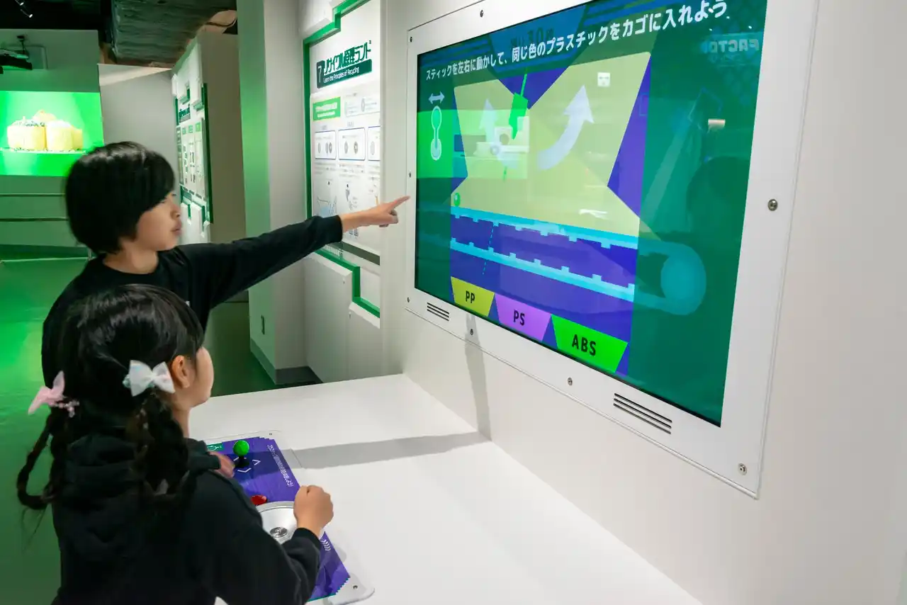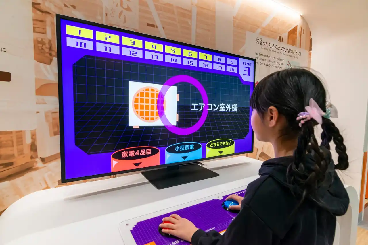 インパクトのある大画面映像に加え、直感的に操作できるインタラクティブコンテンツにより、難しいテーマである家電リサイクルをさまざまな視点から可視化し、身近な問題として主体的に学ぶことができる展示となっています。 |