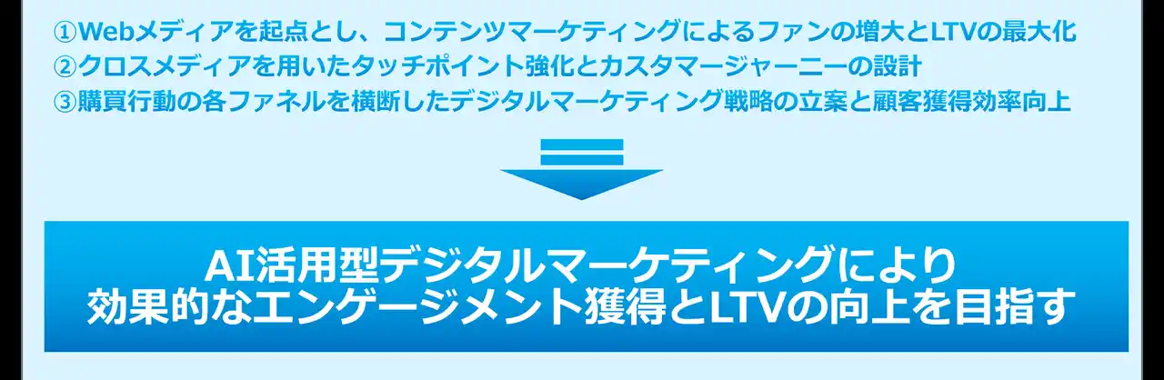また、100以上にのぼる自社メディアや多様なコンテンツといった豊富なアセットを背景に、AIによる解析を通じ、製品や目的に応じた最適なターゲティングと施策実行を行うことで、再現性の高いデジタルマーケティングを実現しています。 |