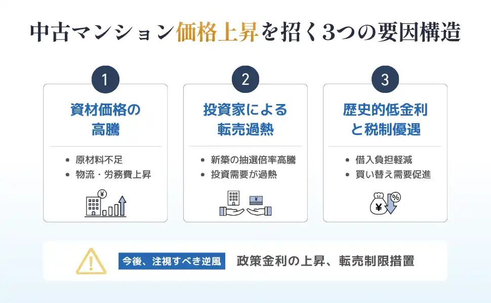 全国エリアでの不動産価格上昇を招く構造的要因は下記3点であると推定されています。 |