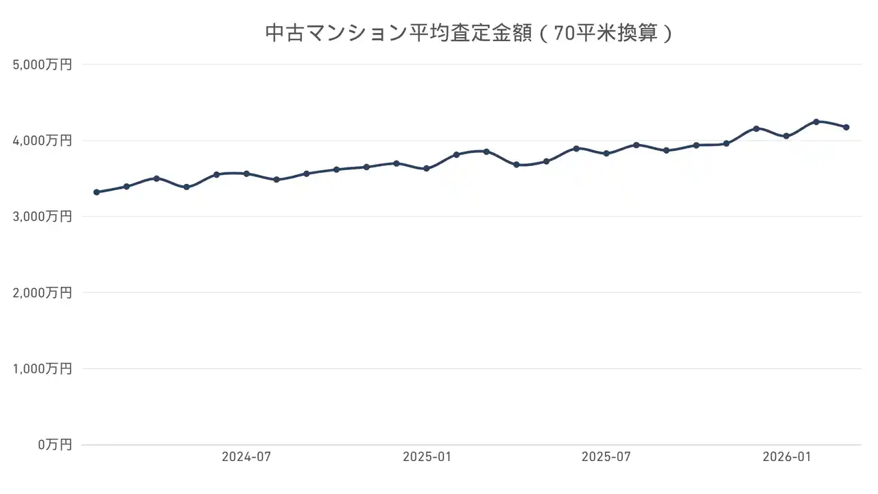 ツナガルオンライン査定を利用した全国の中古マンション平均査定金額(70平米換算)は、約2年間で(2024年5月から2026年2月)、3,389万円から4,243万円のおよそ25%の上昇を記録しています。 |