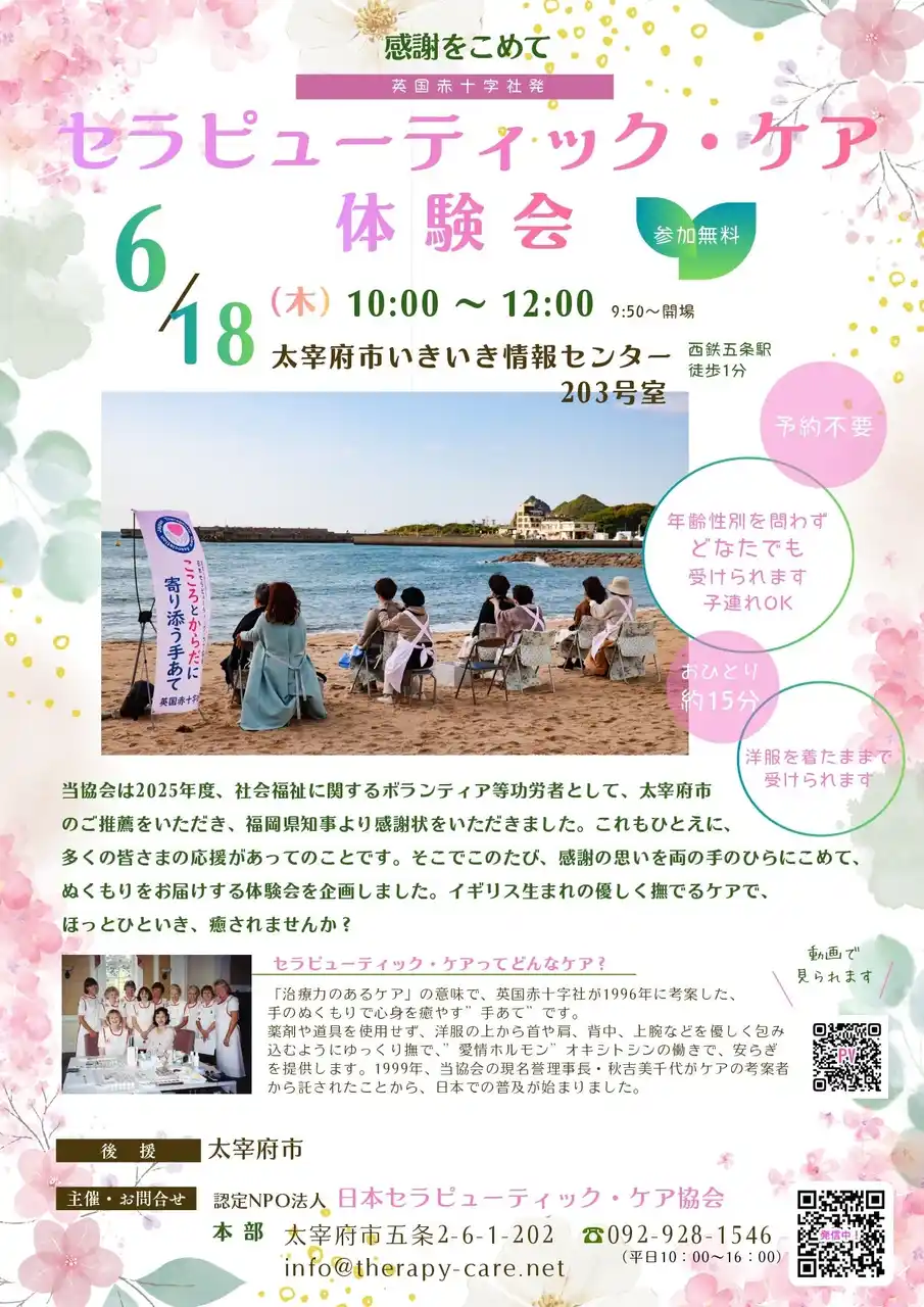 このたび認定NPO法人 日本セラピューティック・ケア協会(本部:福岡県太宰府市)では、「社会福祉に関するボランティア功労者」として福岡県知事より感謝状をいただいたことを記念し、「セラピューティック・ケア」を無料で体験していただける体験会を開催します。 |