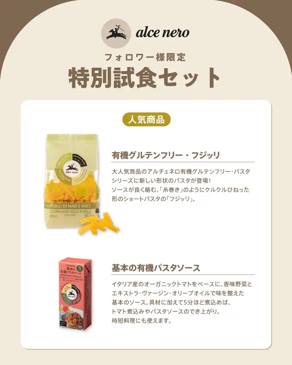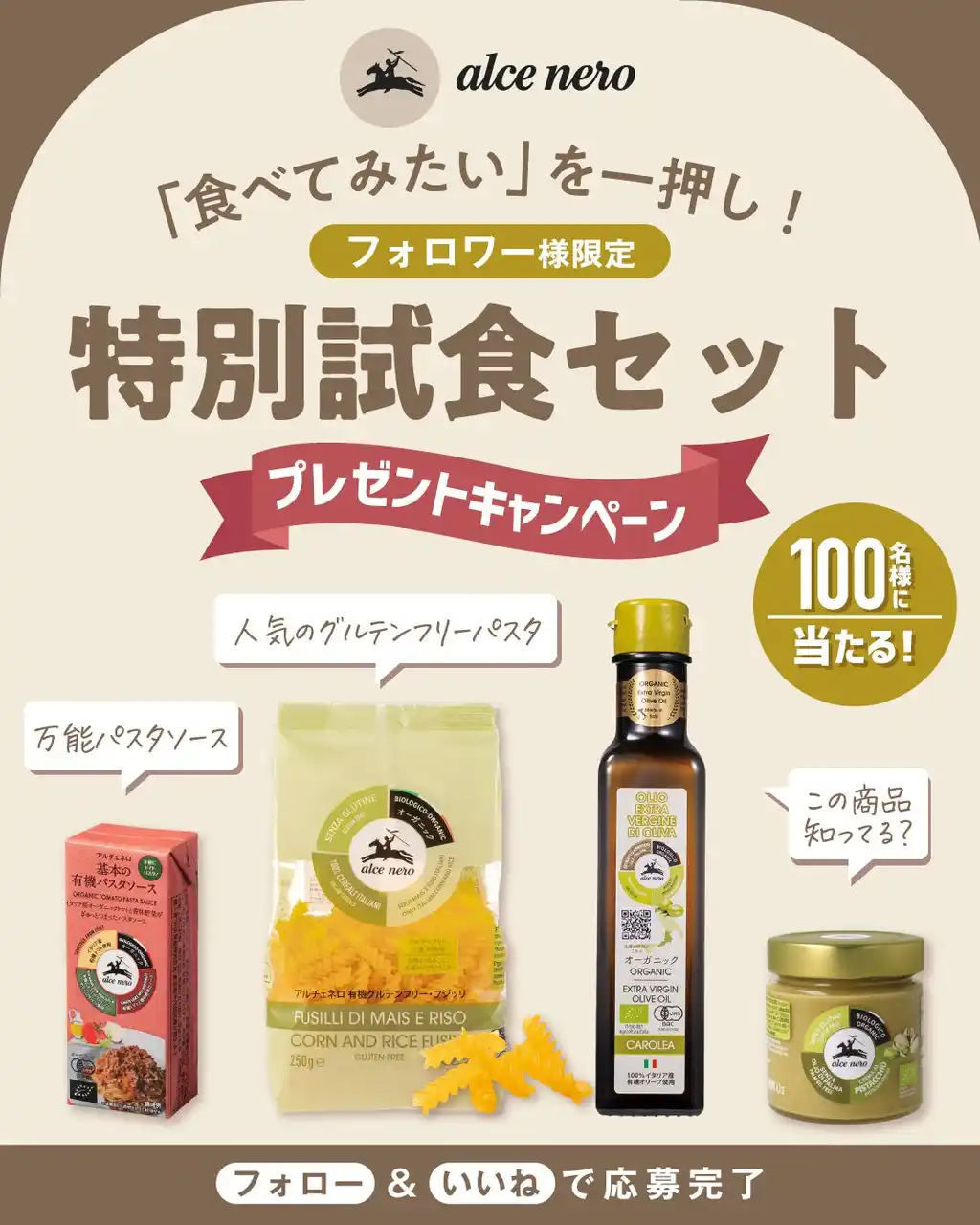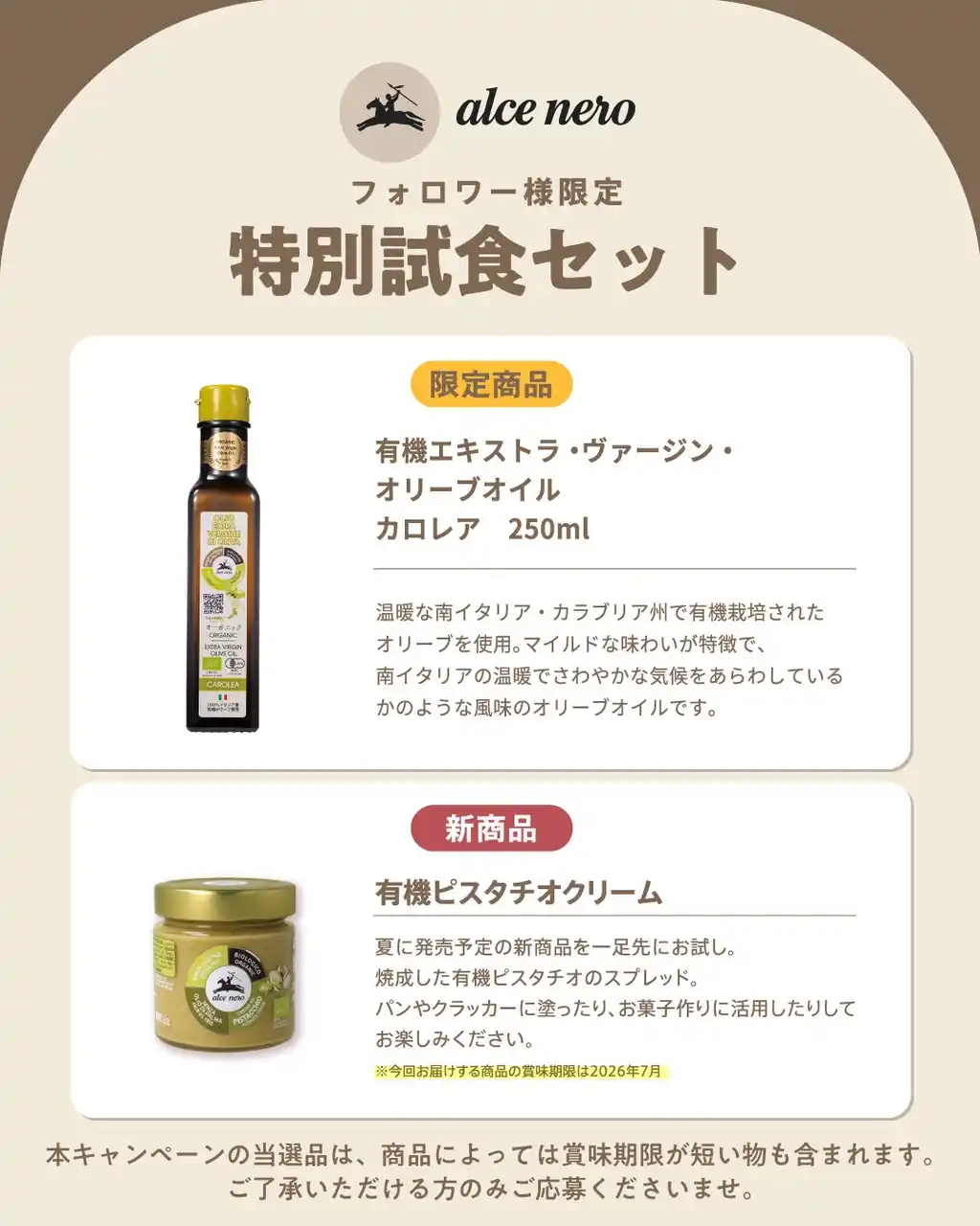 2026年4月28日(火)~5月10日(日) ■応募資格 ・インスタグラムを利用している方(非公開アカウントは無効です。) ・本投稿にコメント+アカウントをフォローをしてくださる方。 ・当選した場合、お送りした商品をお試しいただき、お写真とともに商品の感想や特徴などをご自身のInstagramを中心としたSNSアカウントの投稿を通してお伝えしてくださる方(堅苦しいものではないので、どなたでもお気軽にご応募ください) ■お届け商品内容(予定) ・基本の有機パスタソース ×1 ・有機グルテンフリー・フジッリ 250g×1 ・有機エキストラ・ヴァージン・オリーブオイル カロレア 250ml ×1 ・有機ピスタチオクリーム×1 (賞味期限7月) ※本キャンペーンの当選品(ピスタチオクリーム)は、賞味期限までのお日にちが限られた商品となります。あらかじめご了承のうえ、ご理解いただける方のみご応募くださいませ。 ■当選連絡 当選者100名様に、Instagramのダイレクトメッセージで当選通知をお送りいたします。 ■注意事項 賞品の種類やサイズはお選びいただけません。お届けする賞品は変更になる場合があります。賞品の発送は日本国内に限らせていただきます。選定や決定に関するご質問にはお答えできかねます。本キャンペーンはInstagramが支援、承認、運営、関与するものではありません。 |