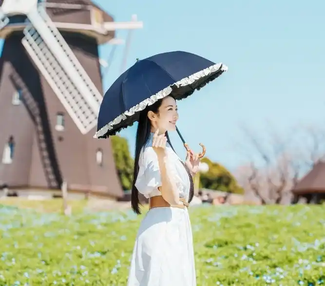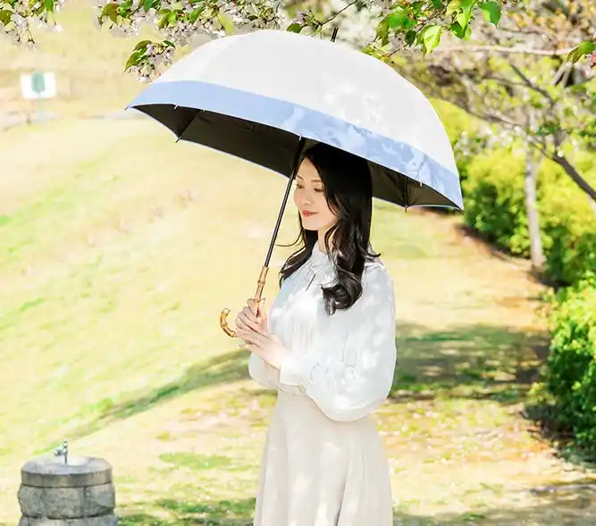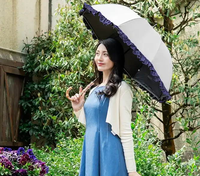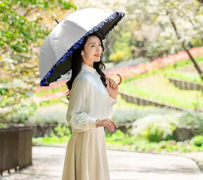 | 16年間愛され続ける「いつまでもキレイでいたい」という願いを叶えたい。そんな想いから生まれた100%完全遮光日傘。独自の日本製生地の質感、職人技の立体フリル、最高級の竹の手元を直接体感できます。 |