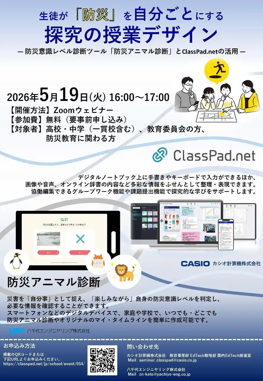 本セミナーでは日本全国で頻繁に発生する自然災害である「水害」を例に、探究をはじめとする様々な授業で活用しやすい学習アプリ「ClassPad.net」を学校現場に提供しているカシオ計算機と河川や防災などの社会インフラ整備を担う八千代エンジニヤリングがタッグを組み、生徒が災害を自分ごととして考え、主体的な行動をするようになる防災探究の授業を提案します。 |