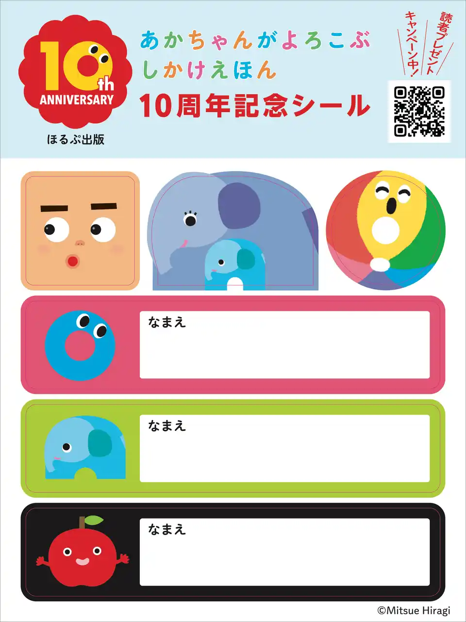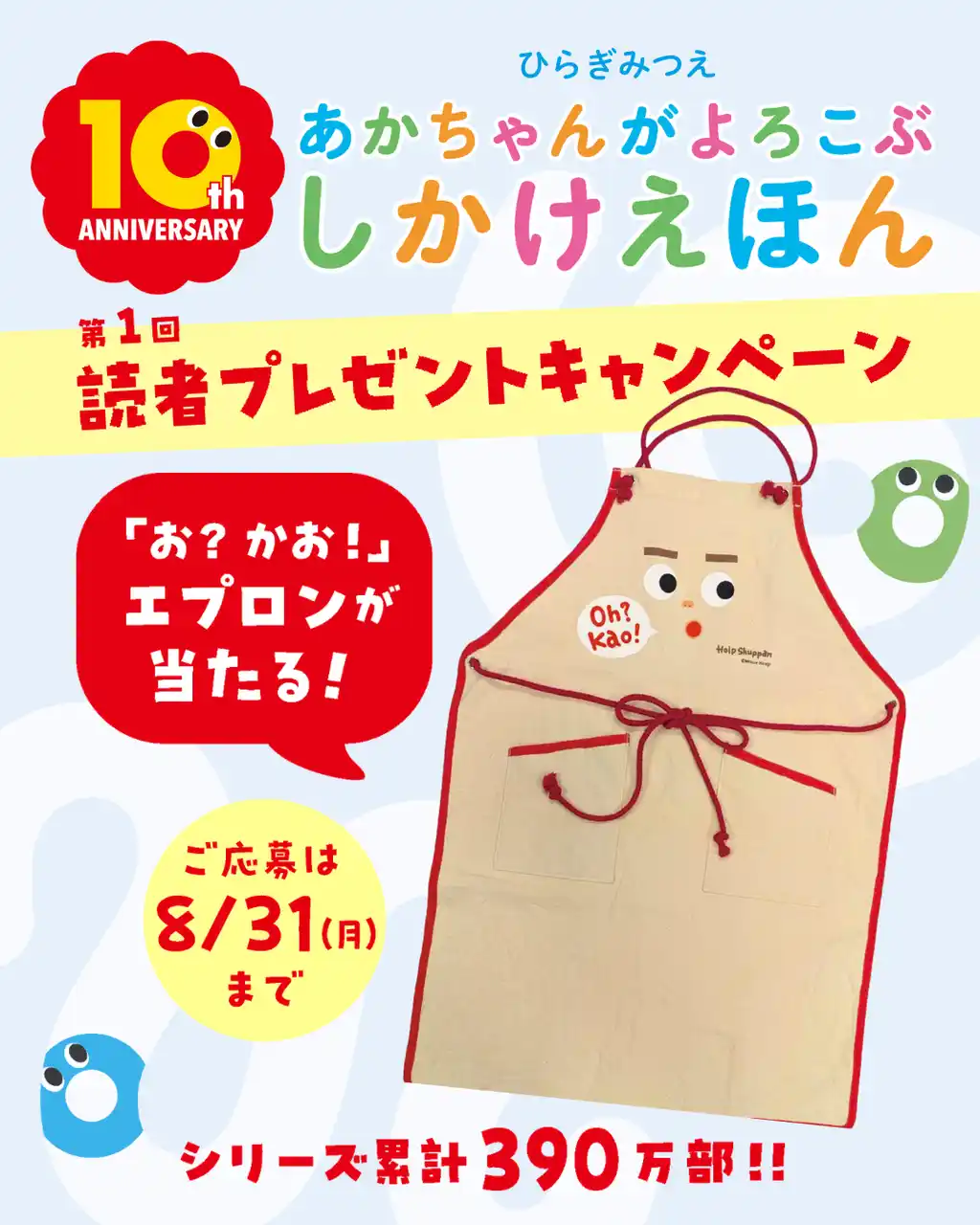 | 『お?かお!』のイラスト入りエプロンが当たるキャンペーンを、5月上旬より開催します。あかちゃんがよろこぶしかけえほん特設サイト、または、フェア開催書店で配布の「あかちゃんがよろこぶしかけえほん10周年記念シール」のQRコードから応募してください。抽選で100名に、『お?かお!』エプロンをプレゼントします。 | ||||||||||||||