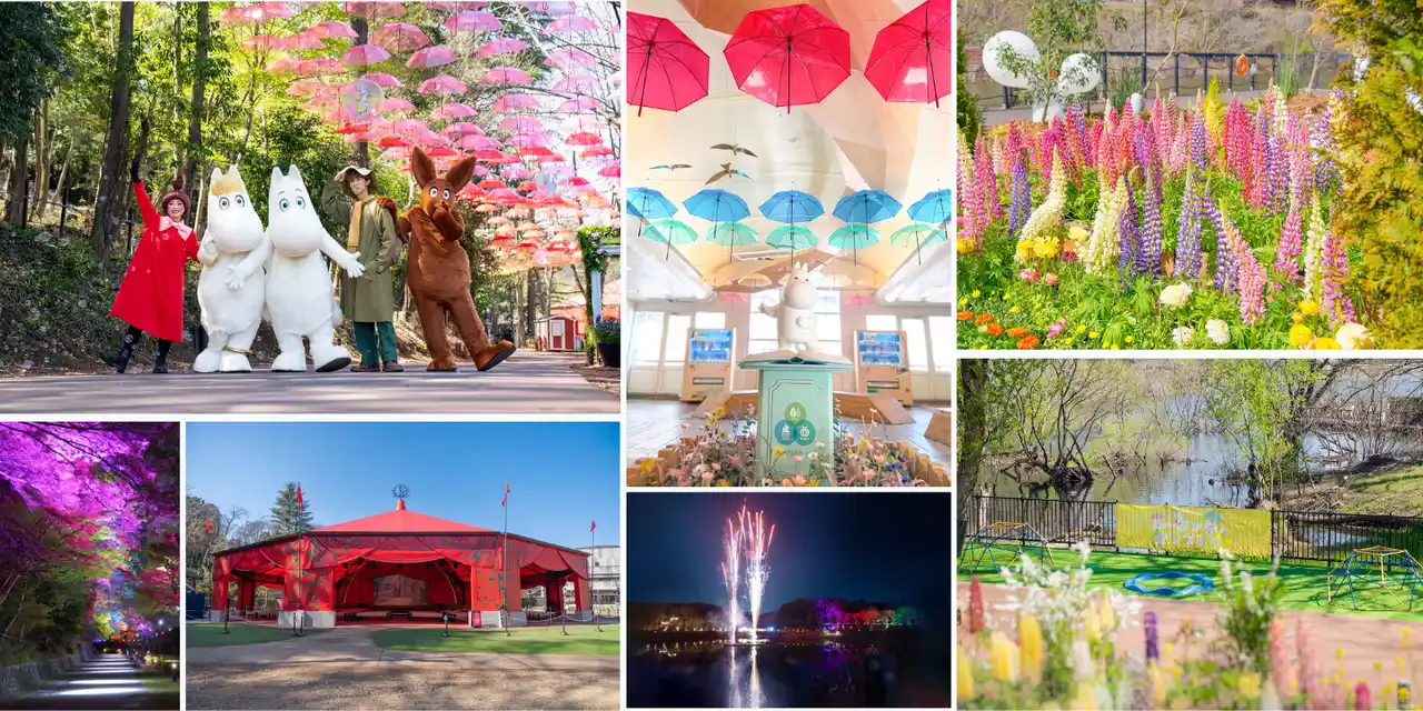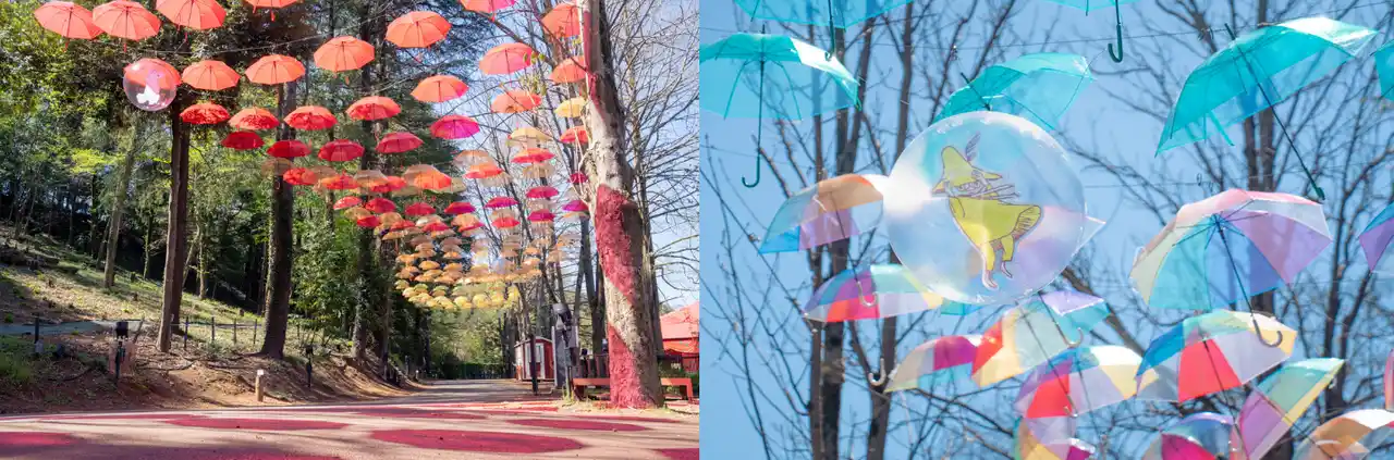 豊かな緑に包まれたパーク内では、頭上に揺れる色とりどりの傘が織りなすカラフルな景色に加え、夜間は幻想的なライトアップを実施。さらに、期間中は「ムーミン谷の湖上花火大会」を毎晩開催し、春の夜空を華やかに彩ります。また、西武鉄道飯能駅にも「ムーミン谷とアンブレラ」イベントと連動しムーミンのオブジェの上空をアンブレラが彩ります。東飯能駅ではムーミンママのオブジェがお出迎え。無料シャトルバスも運行中なので、アクセスも快適です。 |