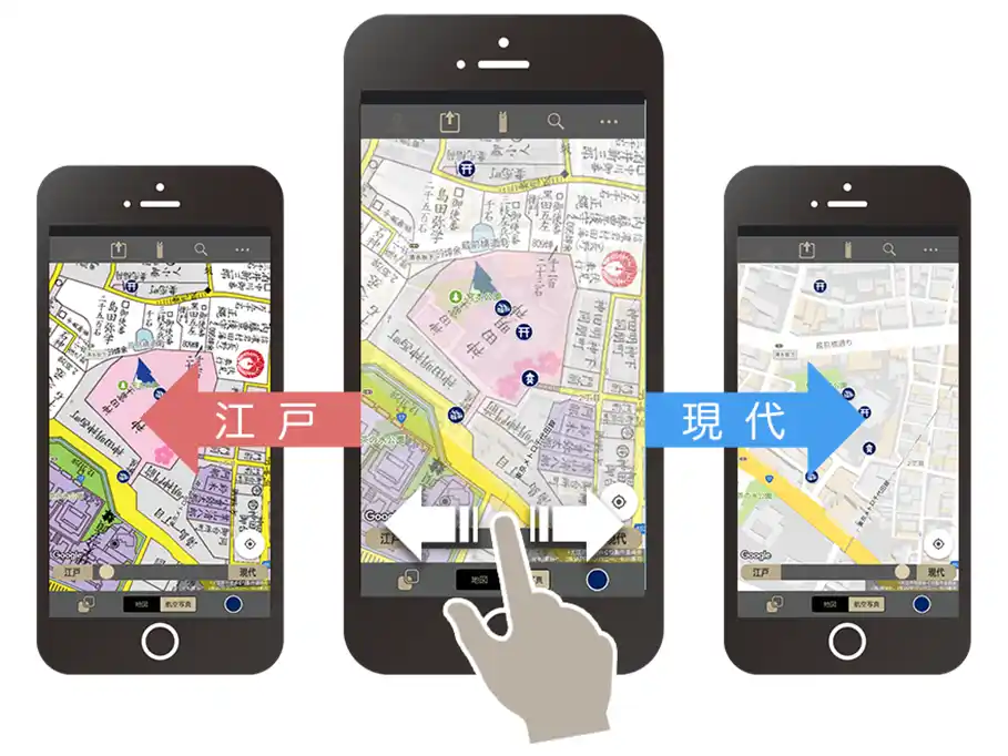 本アプリは「完全描き起こし」により、正縮尺で再現した江戸末期の古地図と現代の地図を、スマートフォンや、タブレットの画面上で容易に重ね合わせて楽しむことができるアプリです。現在地情報とも連動し、東京の町を歩きながら、現地の江戸時代の様子を、瞬時にスマホ上で確認することができることから、歴史好き、地図好きの方はもちろん、街歩きを愛好する皆さまにも、ご支持をいただいております。 |