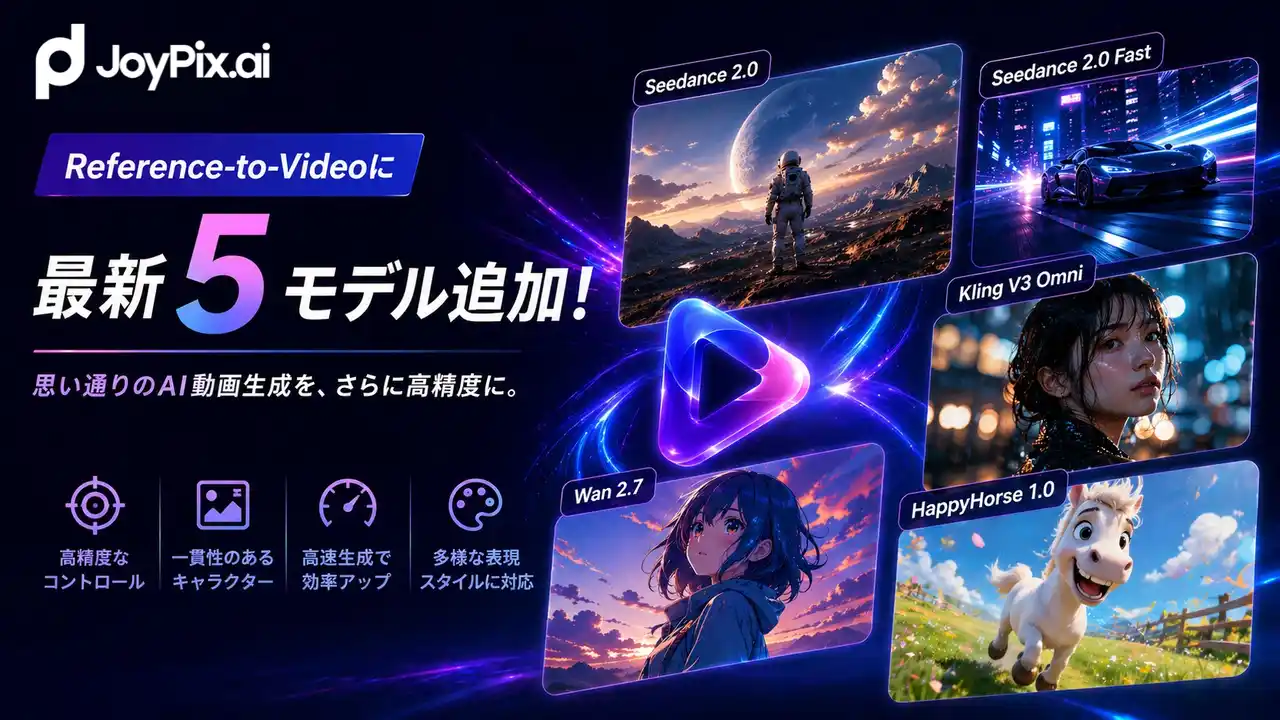 合同会社JoyPixが運営するAI動画生成プラットフォーム「JoyPix.ai」は、クリエイターの表現力を飛躍的に高める「Reference-to-Video(参照元からの動画生成)」機能において、世界的な評価を獲得し話題沸騰中の「HappyHorse 1.0」をはじめ、最新のAIモデル5種(HappyHorse 1.0、Seedance 2.0、Seedance 2.0 Fast、Kling V3 Omni、Wan 2.7)の提供を開始しました。 |