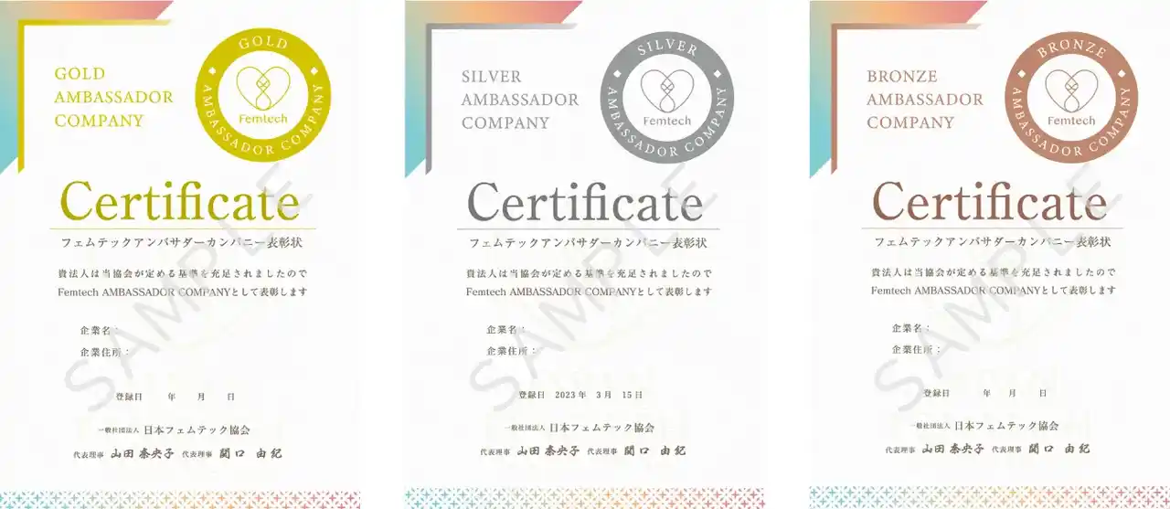 フェムテックアンバサダー・カンパニーは、性差による健康課題に関する基礎知識を、所要時間3分で取得できる当協会認定資格3級を、企業全体で取得いただく制度です。社員一人ひとりが自身の「からだ」と「こころ」への理解を深め、相互理解と心理的安全性を高めることを目的としています。 |