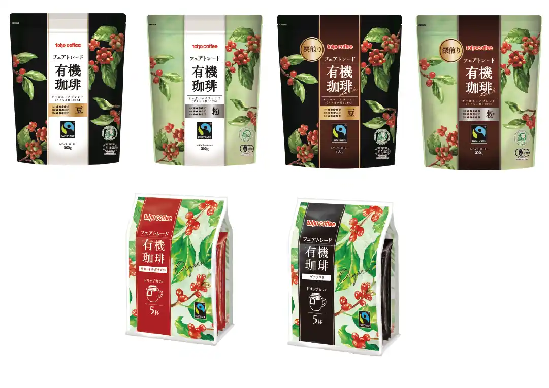 左上からフェアトレード有機珈琲(豆)、同(粉)、フェアトレード有機珈琲ダーク(豆)、同(粉)、ドリップカフェ フェアトレード有機珈琲モカ・イルガチェフェ、同グアテマラ |